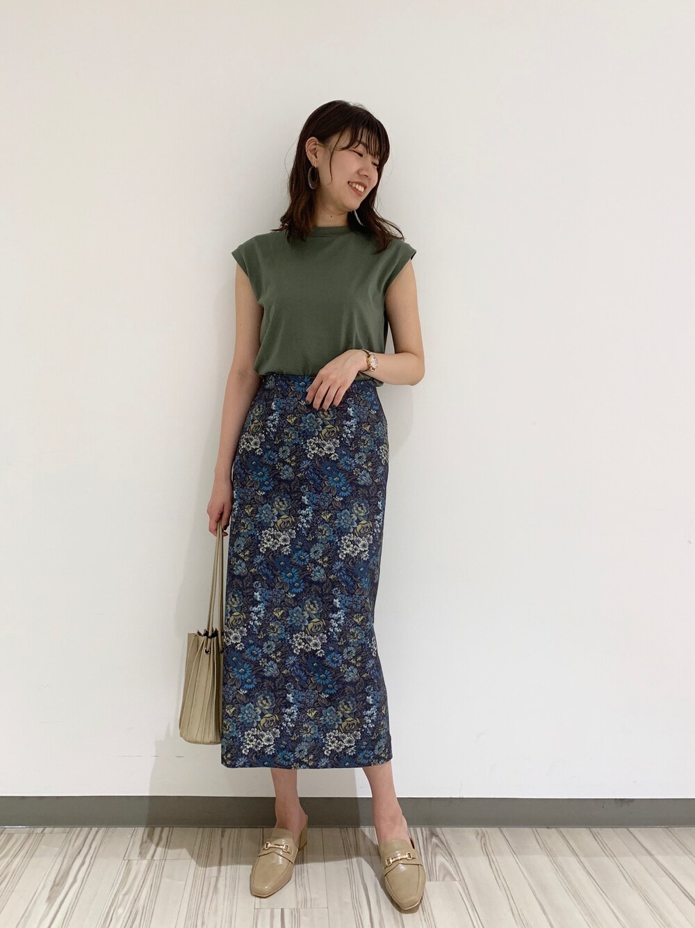 トレンドのゴブラン柄スカート💠 かなりストレッチが効いていて びっくりする履きやすさ🥺 カットソー合わせでカジュアルダウン🌿