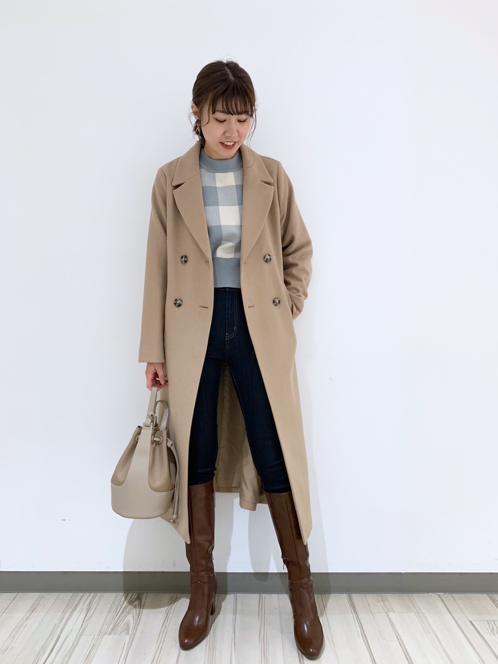 コートは雨除けとウエストリボンが フェイクレザー素材。 トレンド感がたっぷり詰まった ロングコート スタイル。