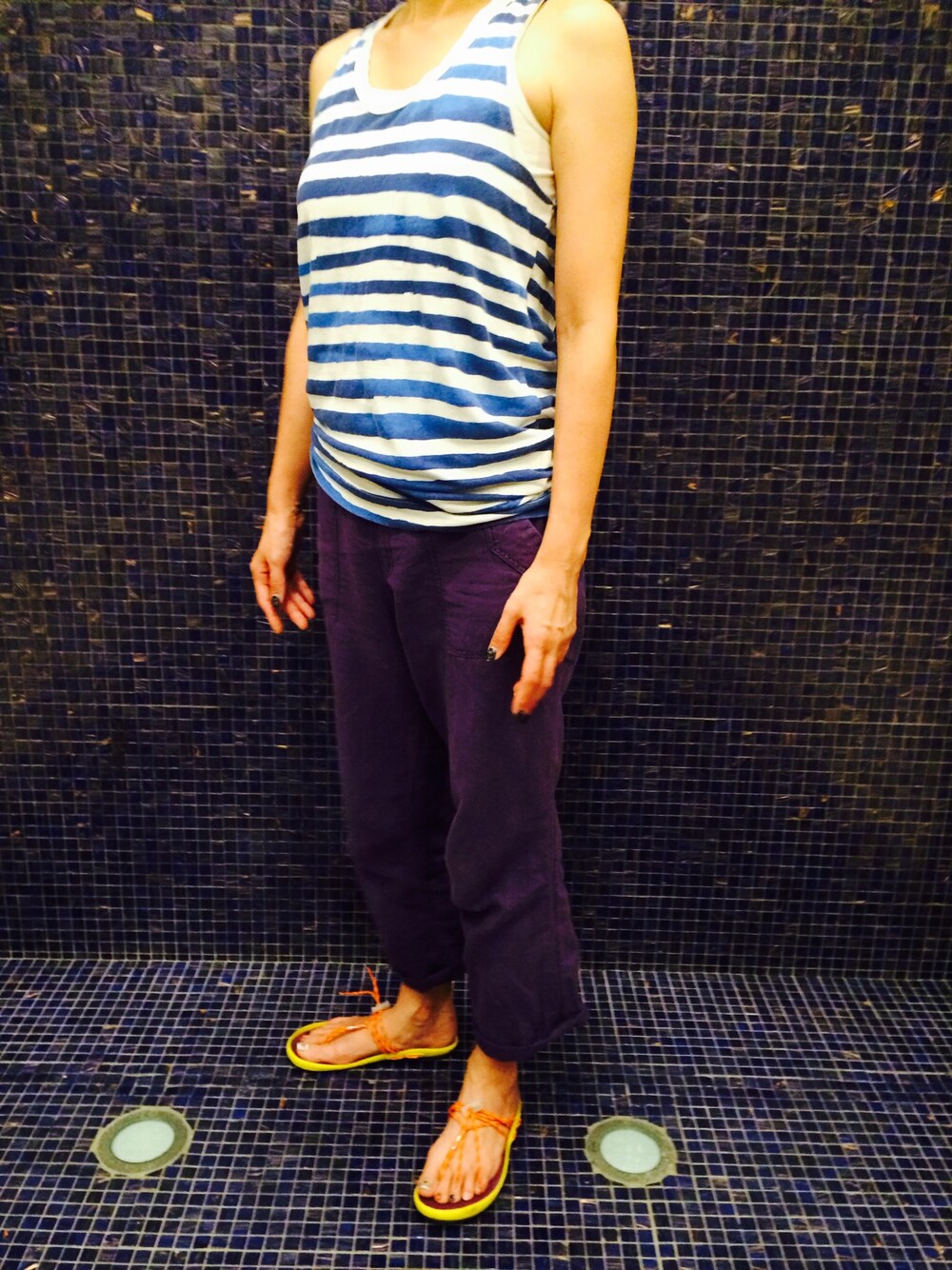 パープルのイージーパンツにブルーと白のボーダーのタンクトップ。