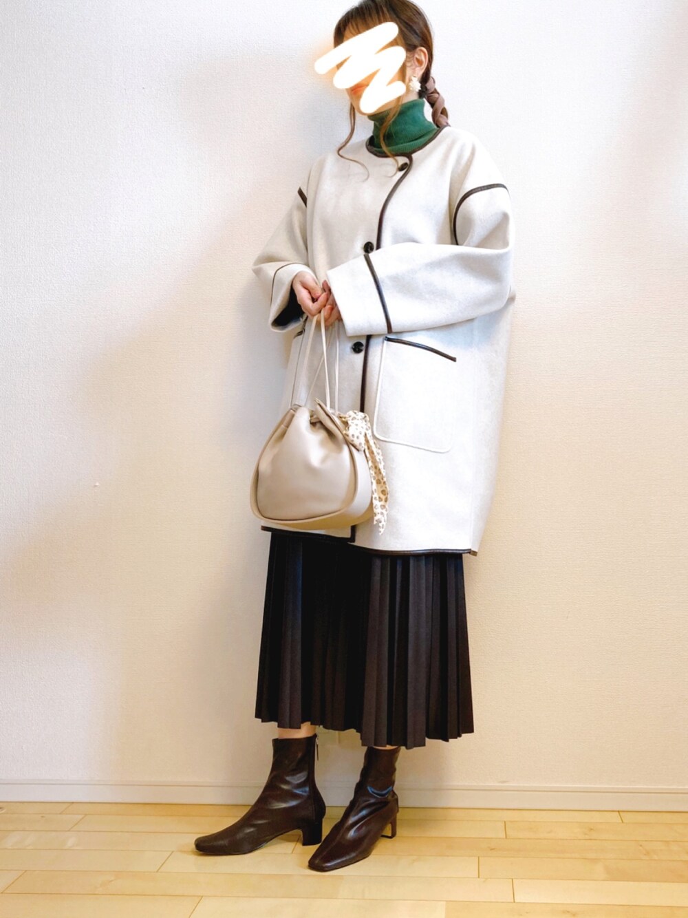 しまむらのパイピングコートと、プチプラのあやさんのエコレザープリーツスカートコーデ