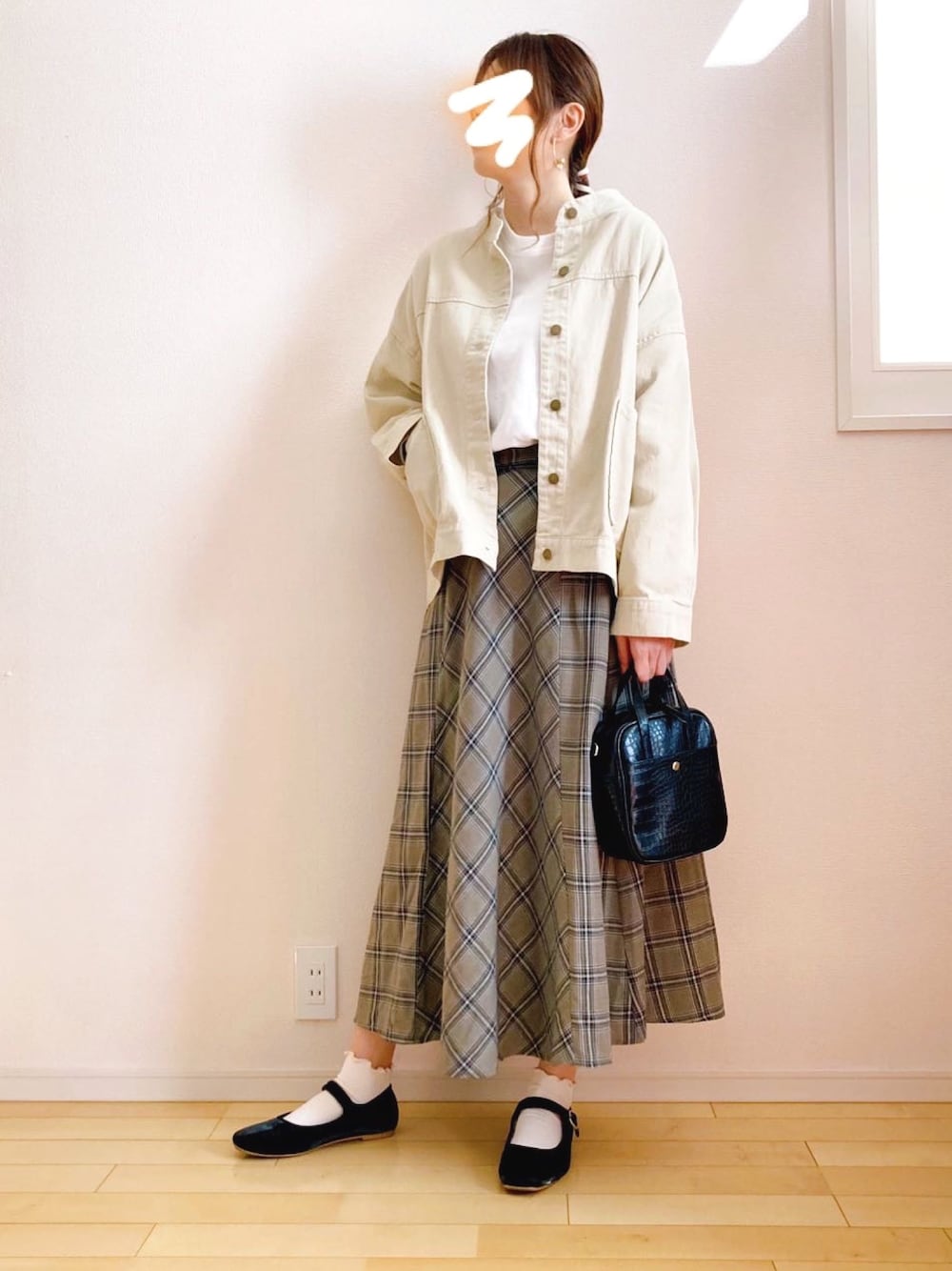 てらさん✖️しまむらコラボのスカート とスクエアバッグに プチプラのあやさんのGジャンを合わせたコーデ 詳細はインスタに載せています
