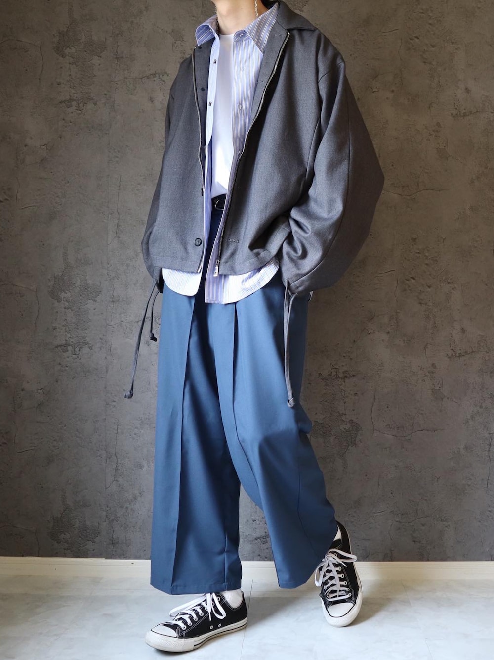おはようございます! 見てくださりありがとうございます 【blue × charcoal gray】 ブルーのカラーパンツとチャコールのブルゾンの色合わせ パンツとブルゾンの間に淡い色のストライプシャツを挟むことで中和を図る インナーはタックインをしてスタイルアップを