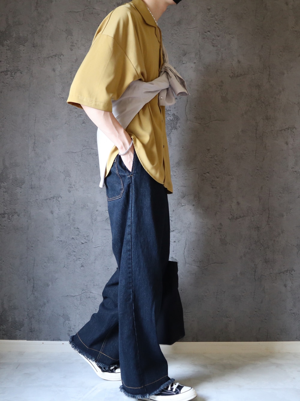 おはようございます! 見てくださりありがとうございます! 【blue × yellow】 お気に入りのシャツと最近買ったデニム デニムとイエローの合わせは相性抜群🐝 シャツにシャツをたすき掛けするちょっと小慣れたテクニックも入れてます🤟🏻 カットオフになっている裾が程よいアクセントになっていて◎ ではでは!!!