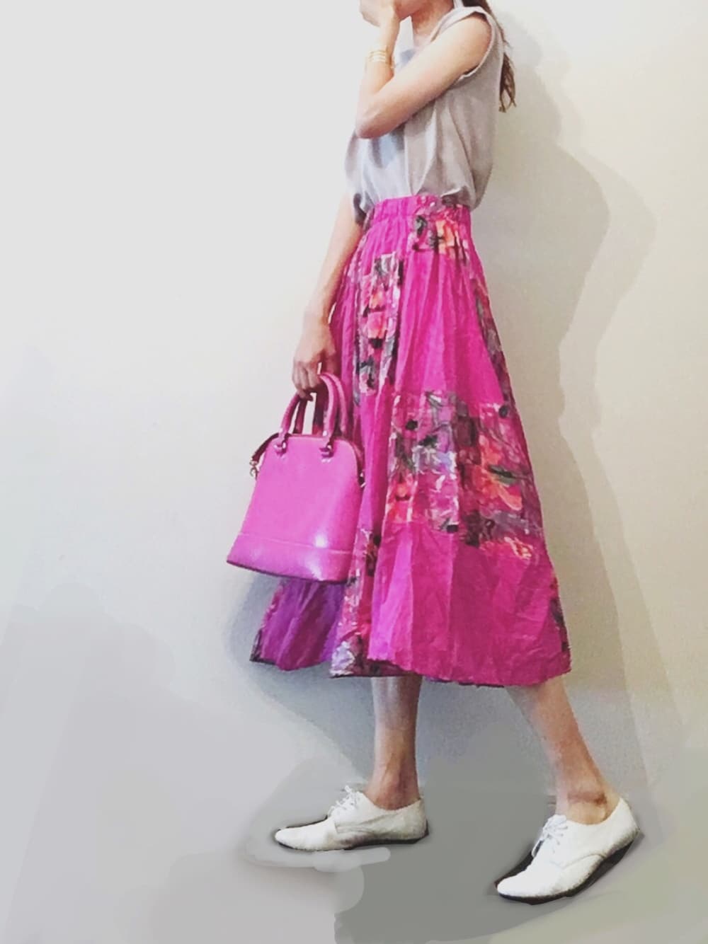 お気に入りのヴィンテージスカートを、ライトグレーのトップスと合わせて夏っぽく、でもリゾート感は出しすぎたくなかったので、足元に気をつけました。 かわいいけどビーサンやスニーカーだとラフすぎるところを、レースアップシューズがちょうど良いきちんとさ。 コーデをピンク・ライトグレー・白の3色に抑えました。 白の靴って便利☺︎