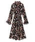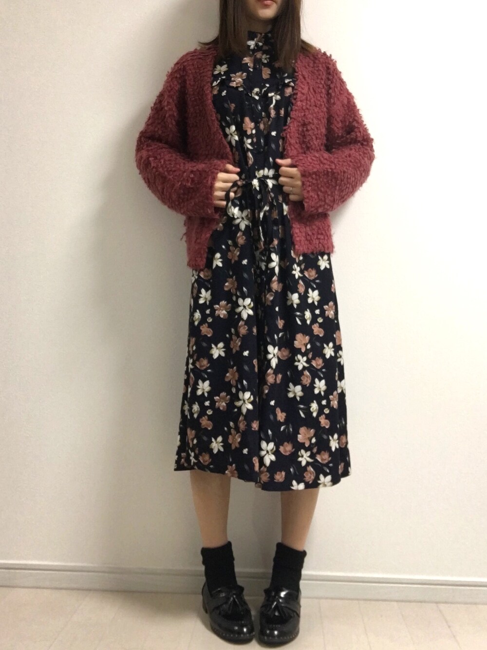 花柄ワンピース×ピンクのループカーディガンのコーディネートです。