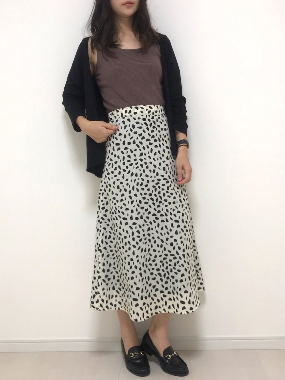 ブラウン×ダルメシアン柄スカートのコーディネートです。