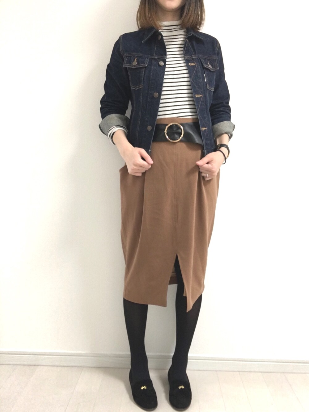 暖かくなってきたからGジャンで。 ベージュのタイトスカートは前側にスリットが入ってるのがポイント。