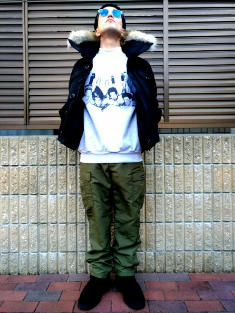 「空を見なよ」 液晶画面から顔を上げてみると、果てしない青空が広がっていたんだ。 サングラスに空を映して、自然の壮大ささえも味方につけてみた。 加えて、若いときのレッチリがプリントされたUSAのスウェット。 青さがいいねっ!