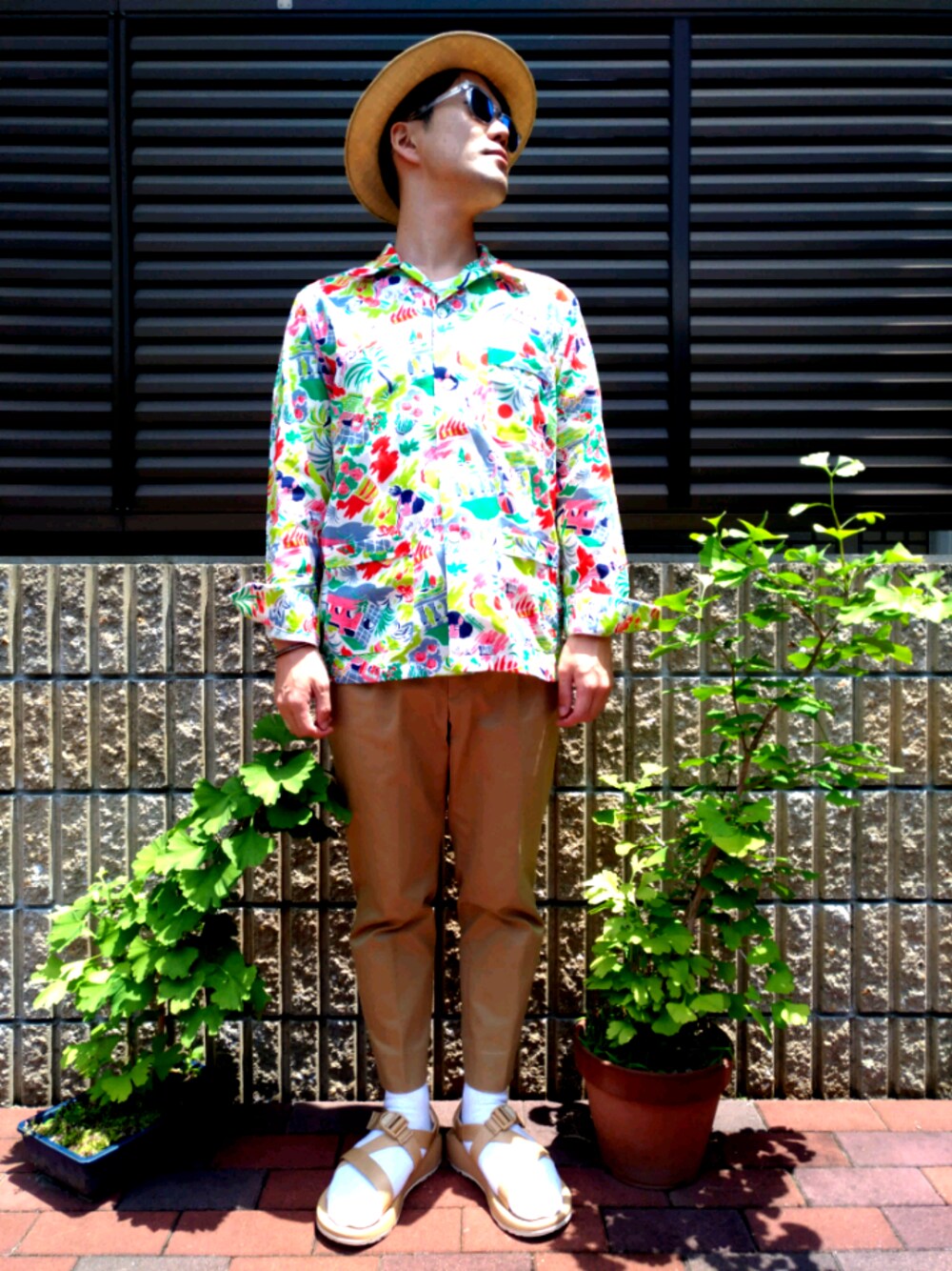【ツーリストinリゾート】 ハバーサックのトロピカルなシャツブルゾンに、歩きやすいチャコのサンダルを合わせて軽快な観光客を表現。 サンダルには白ソックスを組み合わせて遊び心も抜かりなし。 "Hey, taxi !"