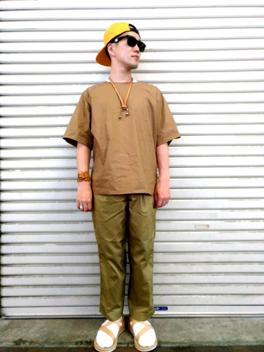 【オールベージュ】 ベージュなら、トップスとボトムス両方がオーバーサイズ気味でも上品にまとまるんだなあ。まろを イエローのキャップを逆さかぶりして小僧感だすのも忘れない。