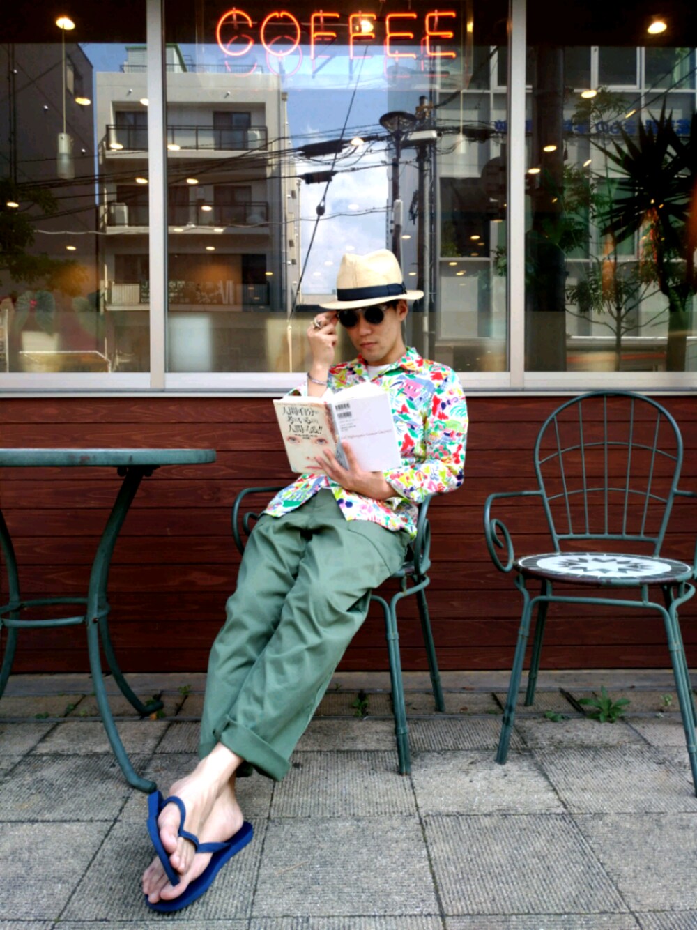 【TROPICAL LOVE】 電気グルーヴの最新アルバムである「トロピカル・ラヴ」からインスピレーションを経て、ハバーサックのトロピカルなシャツブルゾンをオリーブのベイカーパンツで大胆に着崩しました。 「いや、長袖暑くね?」 この写真撮ったあとにシャツ脱いだのは言うまでもない。