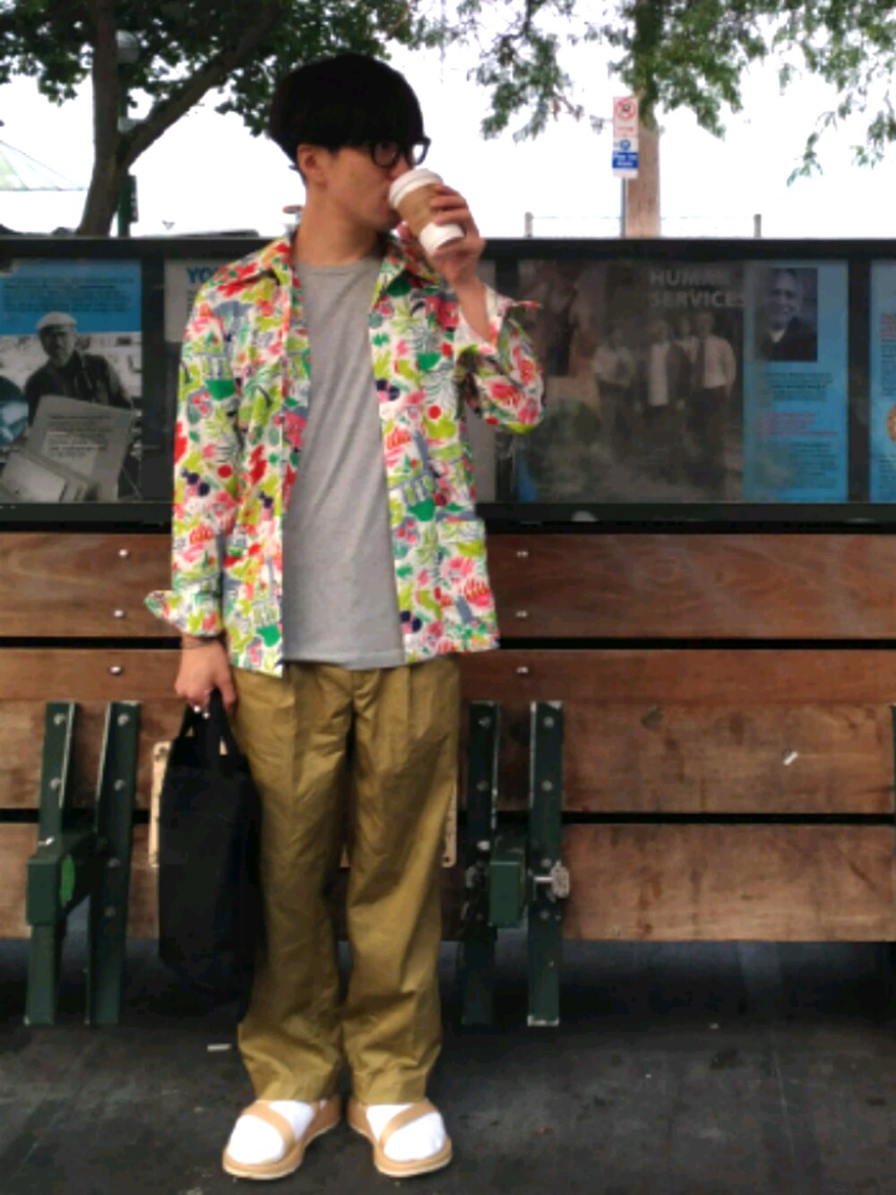 【パイクプレイスでチルアウト】 朝6時にスタバ一号店に行ってホッと一息。 ハバーサックのトロピカルブルゾンは、遊び心の中きちんと感も出るので好きです。これだけでパンチ効いてるので、他のアイテムはシンプルな色使いでまとめました。このあとコーヒーを白ソックスにこぼした。