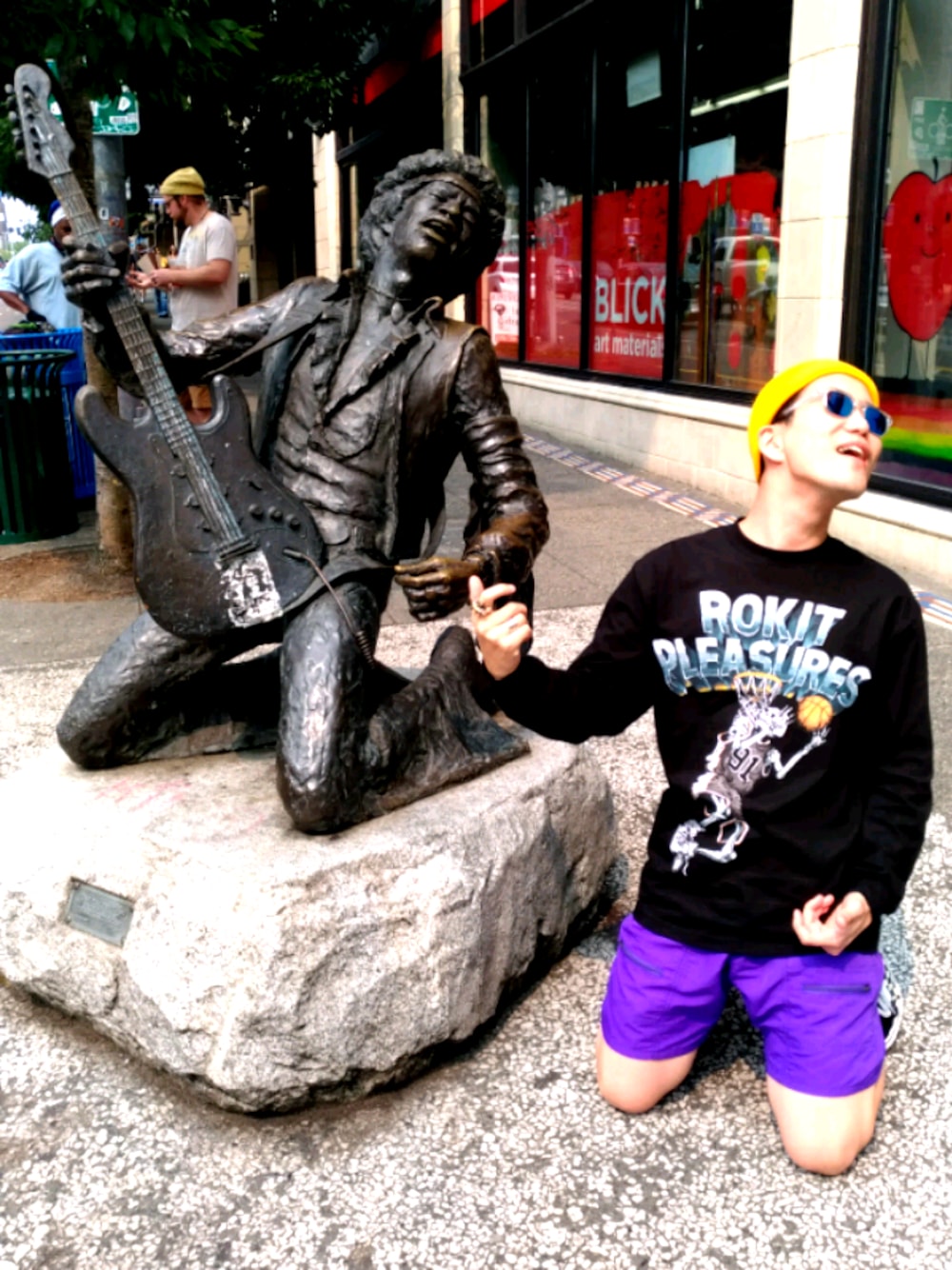 【Are You Experienced?】 シアトルはかの有名なジミヘンの出身地。スタチューもありました。 いつでも膝つけるように、バテンのショーツはパープルをチョイス。レイカーズカラーが好きなのでイエローのニットキャップを合わせました。ま、ここはLAじゃなくてシアトルなんだけどね。