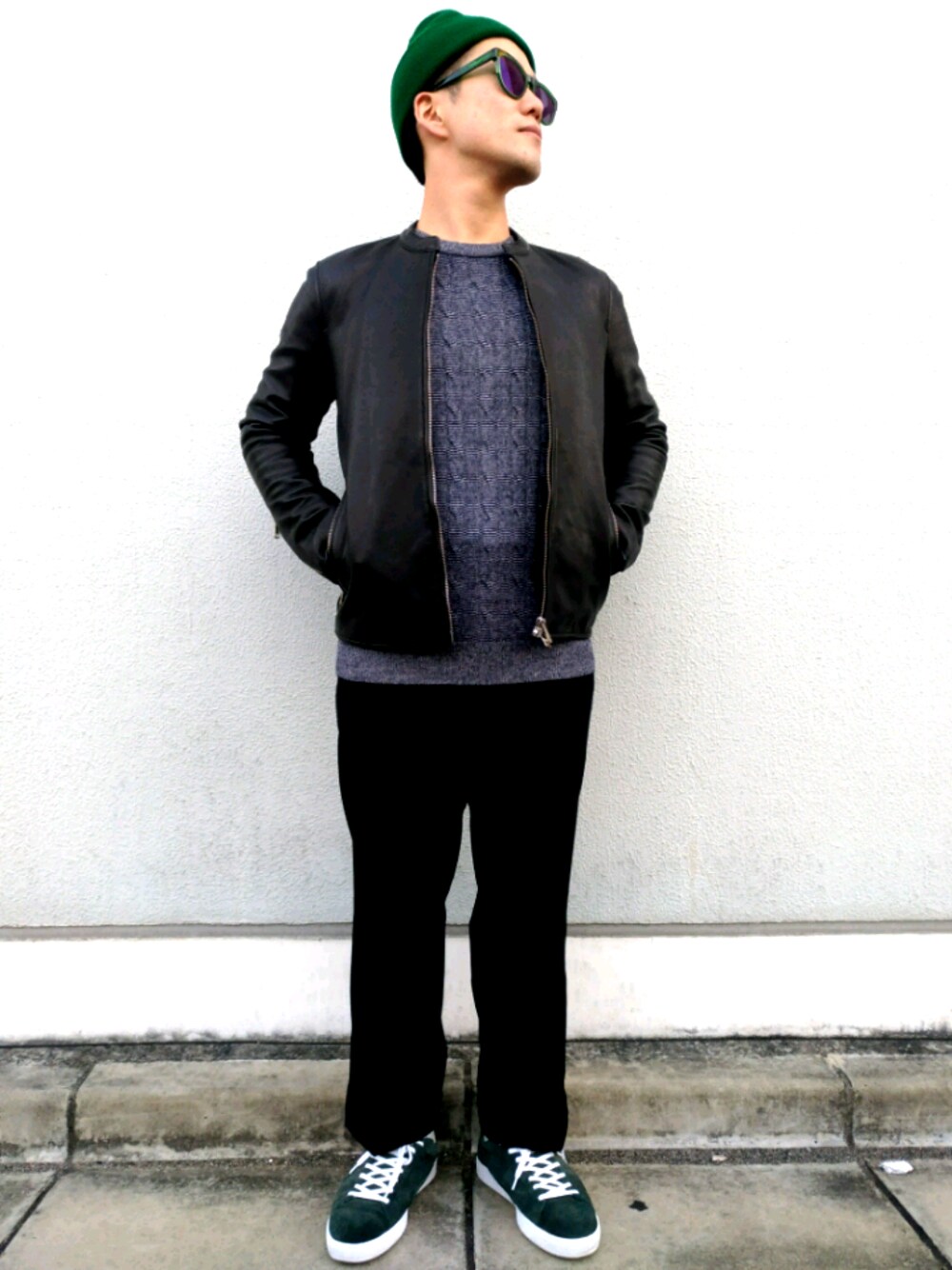 【MALOスーパードライ】 冬でもレザージャケットが着たい。 でも寒くね? そしたら中を暖かくすればいいじゃないか。 ってことで、カシミヤのニットにウールのパンツを合わせて辛口冬スタイルの完成である。 色がないと寂しいので、いつものオリーブサンドイッチで仕上げる。