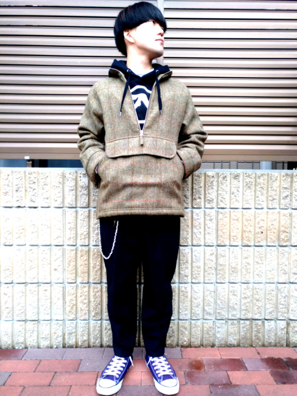 【sk8er boi】 アムステルダムのスケートウェアブランドであるPOP TRADING COMPANYのアノラックをガブッとかぶって参る。 モダンネスと暖かみのあるハリスツイードのハイブリッドが楽しめる唯一無二のモデル。 深めのハーフジップでインナーのプリントが見えるのもポイントで、Aphex Twinのフーディーをチラ見せしつつ。 その他はブラックで締める。 外しにパープルのコンバース。
