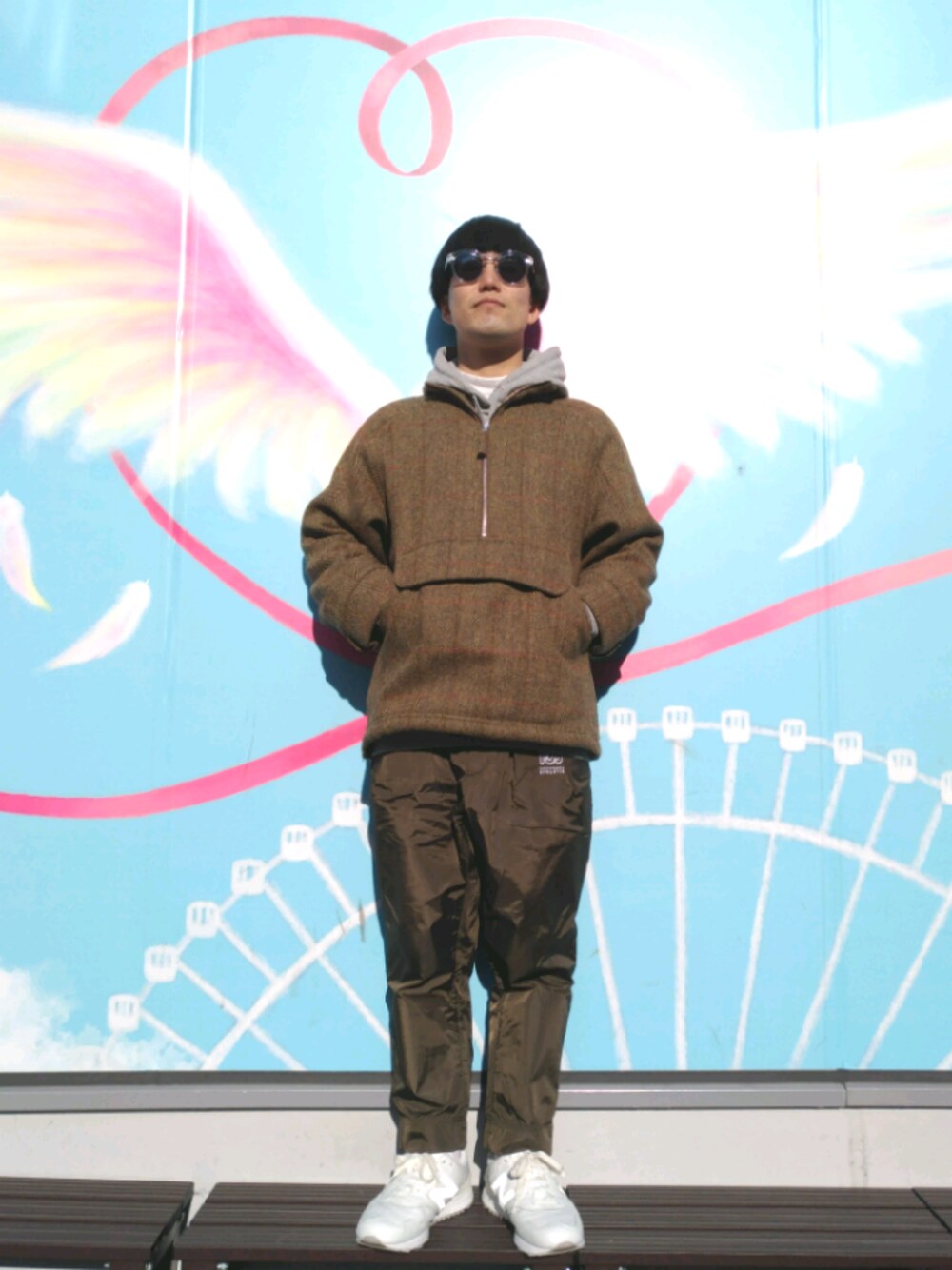 【天使ノロック】 トラディショナルなツイードのアノラックパーカーに、シャカシャカ系のパンツとクリーンなホワイトスニーカーを合わせてバランスを取りました。 天使の羽をつければCherub Rockコーデの完成だ。