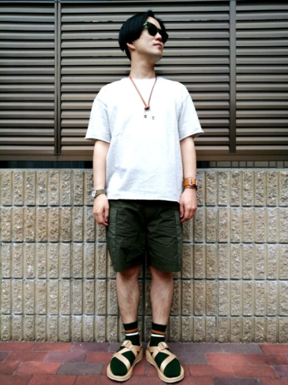 【Relaxin' Military Style】 ちょいデカめの半袖スウェットにカーゴショーツとスポサンを合わせて、リラクシングミリタリーを表現。 レザーの小物でお上品さをプラス。 夏なんだな。