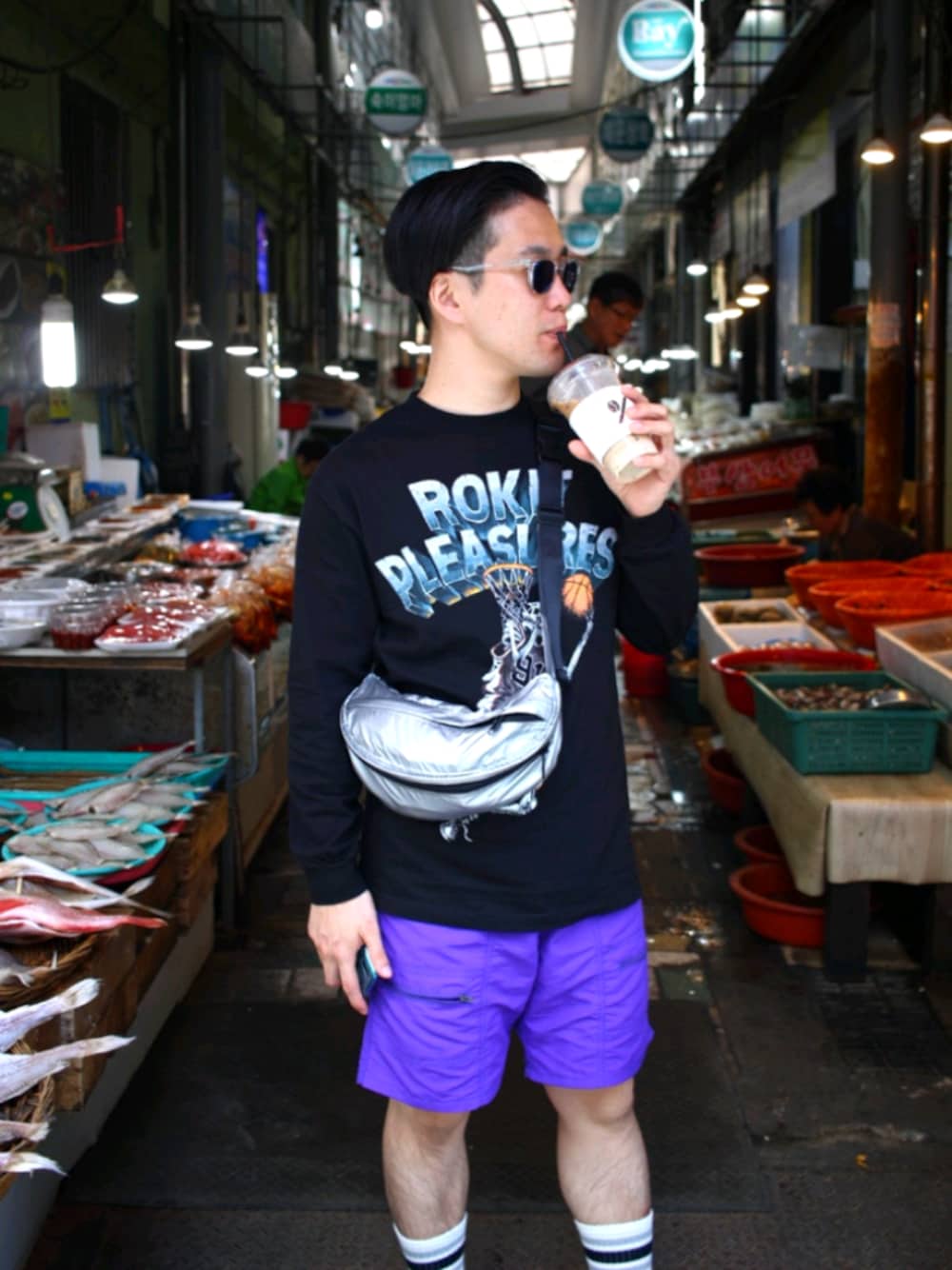 【ショーツ×ロンT】 釜山の市場にて。 パープルとブラックが合うのはいわずもがな、シルバーのボディバッグでフューチャリスティックに決めてみました。