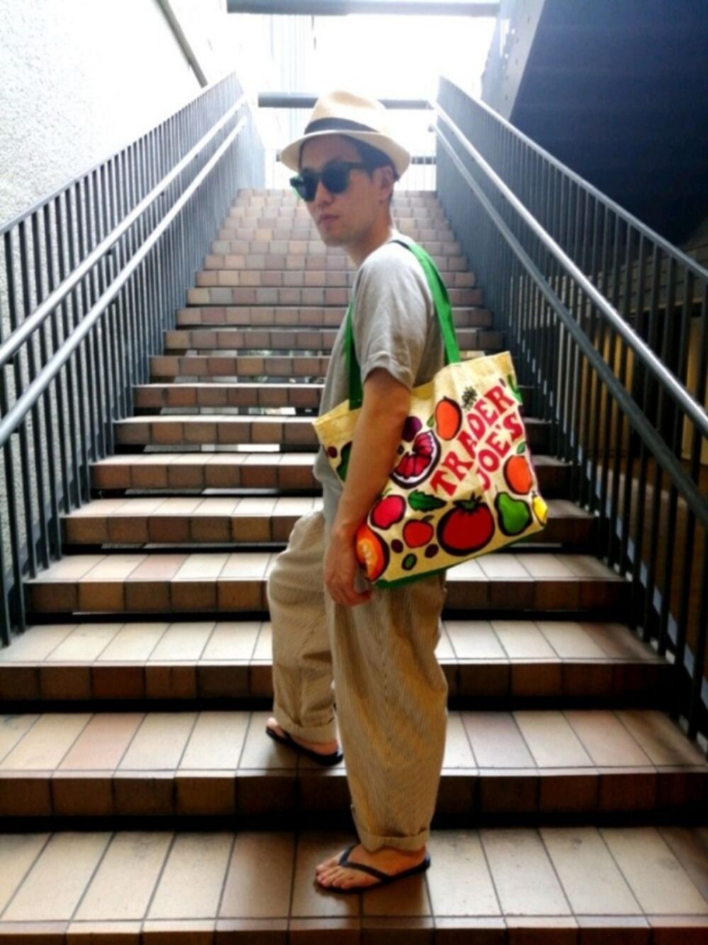 【一寸其処まで】 スーパーの買い出しにも出で立ちは抜かりなく、ハバーサックのスウェットTとシアサッカーのワイドパンツでキメる。 トレーダージョーズのグローサリーバッグがアクセントね。