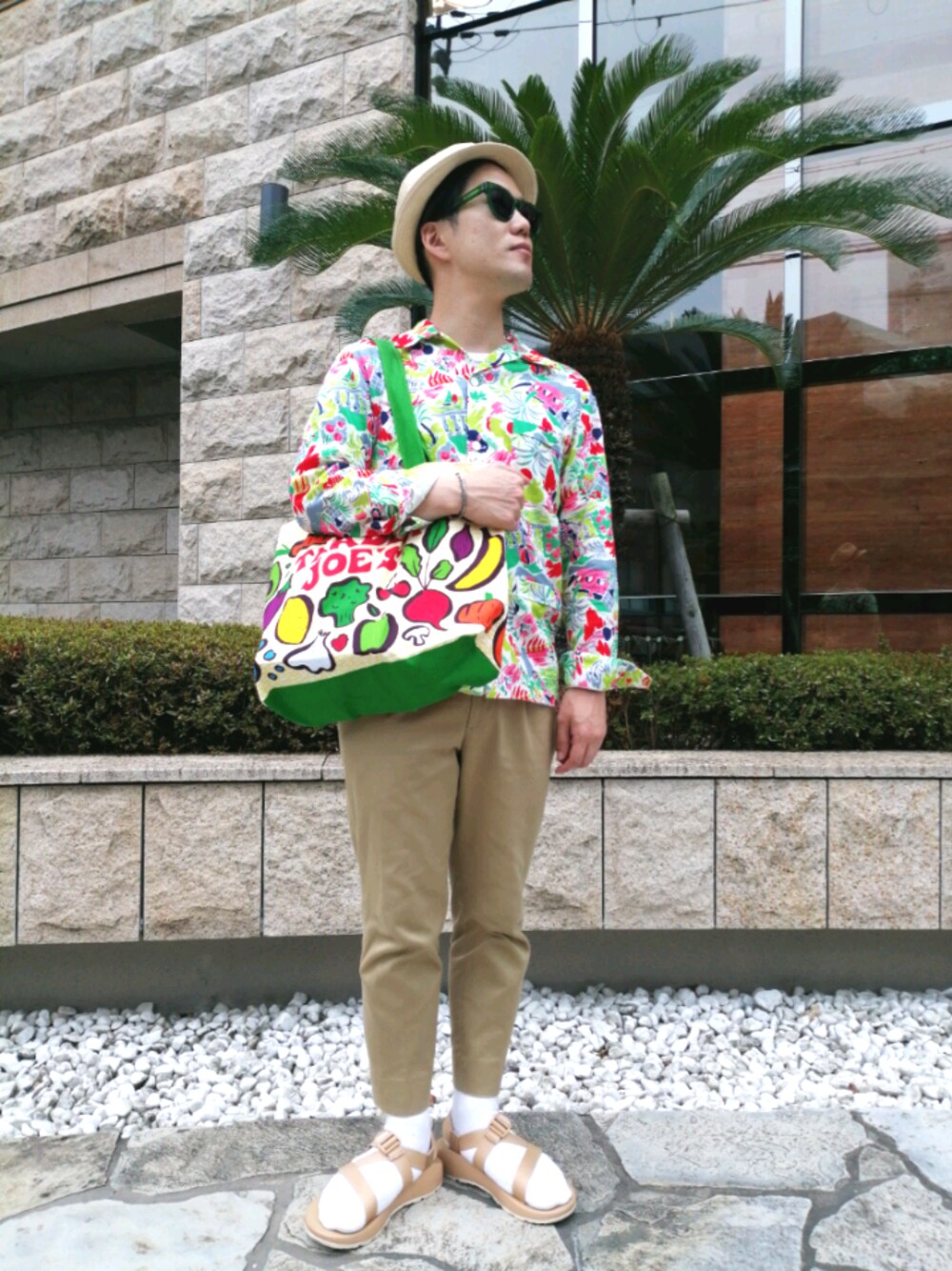 【リゾートショッピングSTYLE】 トロピカルなシャツブルゾンに合わせて、これまた色とりどりなトレーダージョーズのグローサリーバッグを合わせました。他はベージュでまとめてます。 実はサングラスもクリアグリーンで仕上げて、究極自己満的コーディネートの完成