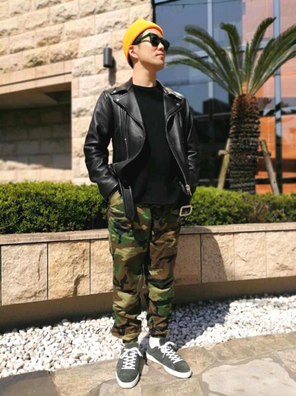 #スーパーでおしゃれ スーパーマーケットにおしゃれして行ってもいいじゃない。 モーシャンのナイロンパンツにレザーライダースで重厚感を加えて。 黄色の帽子でソーシャルディスタンス。