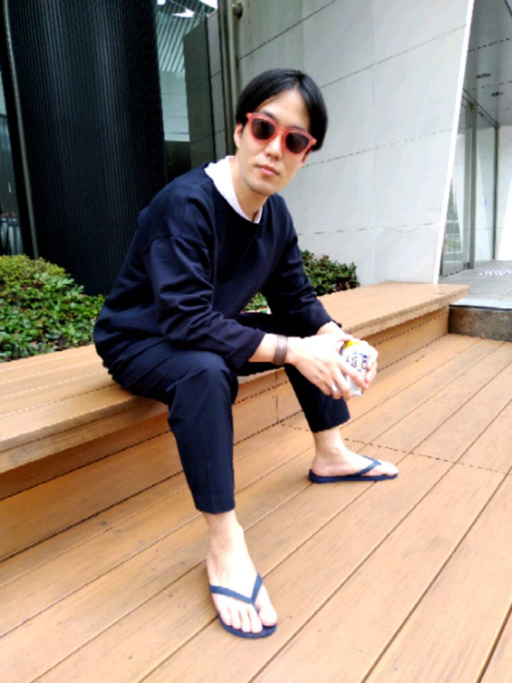 ソロテックスのエフォートレスなパンツに同系色のカットソーを合わせて、ビーサンで完成のオトナリゾートスタイル。 ピンクのサングラスでハズします。