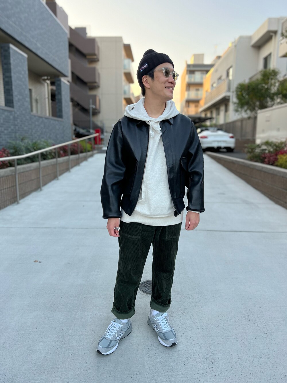 A-2フライトジャケットをベースとした骨太な出で立ち。 オーバーサイズは卒業気味です。 ハードなイメージのレザージャケットは、インナーのフーディーやニットキャップで柔らかさをプラス。
