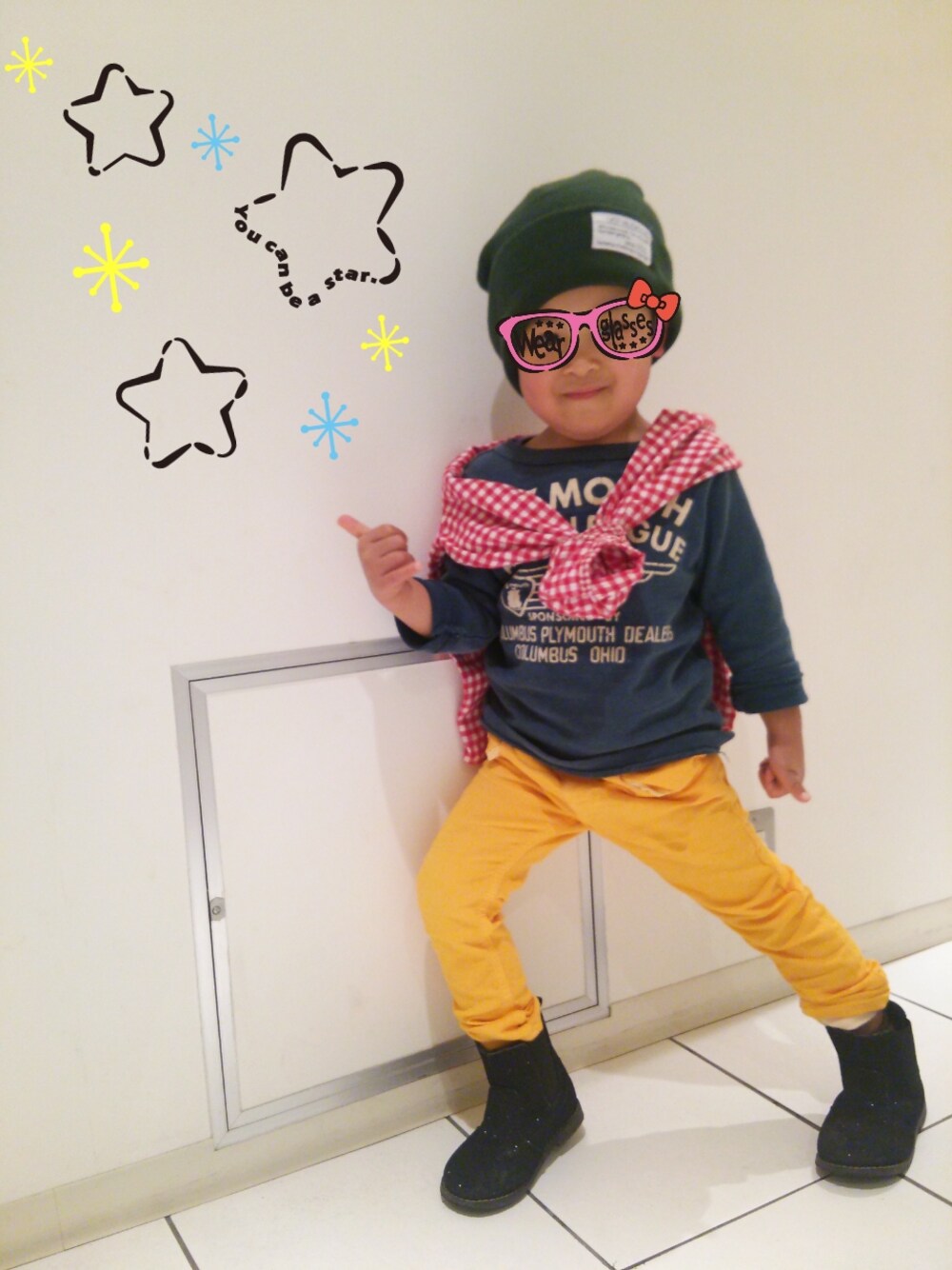 トレーナー…デニム&ダンガリー パンツ…ムージョンジョン シャツ…UNIQLO ブーツ…JUNKSTORE キャップ…しまむら 最近黄色のパンツがお気に入りの息子…