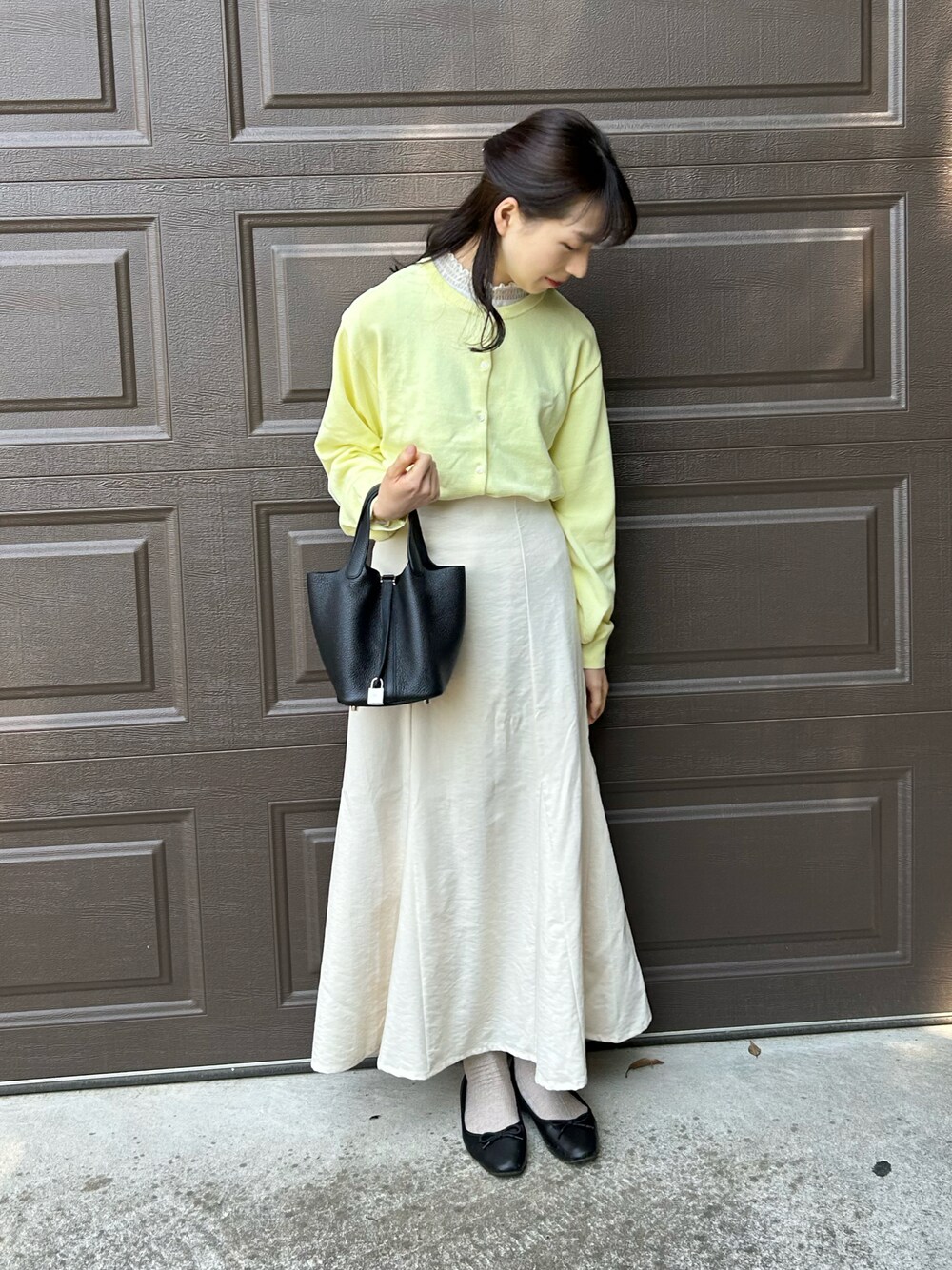 今日は春コーデ🌷 レモン色のカーディガンに アイボリーのマーメイドスカート を 合わせてみました!