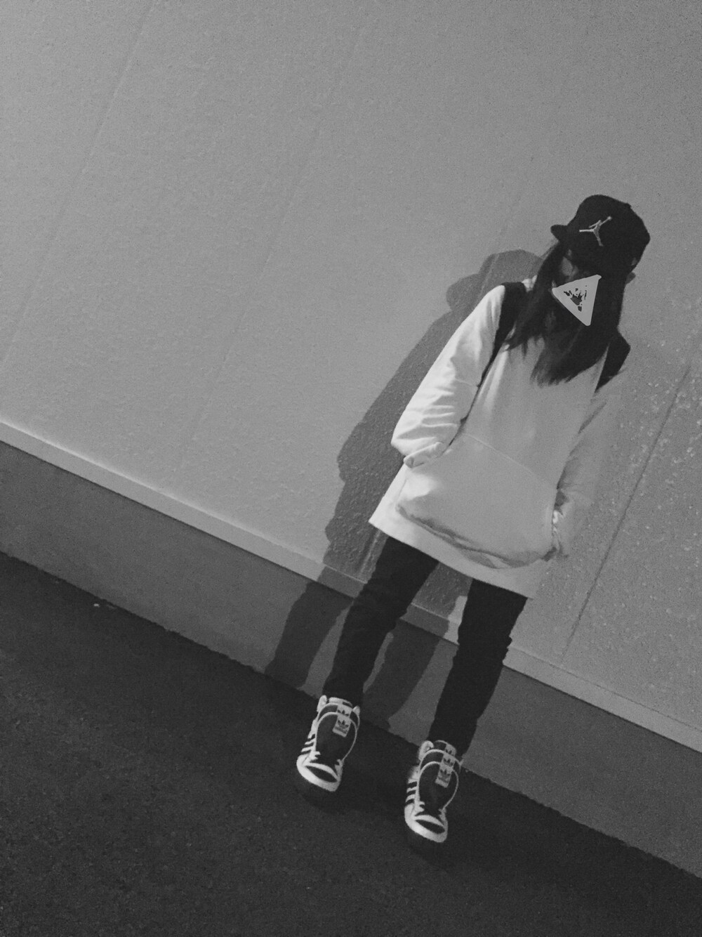 ストリートスタイル 夜の街を徘徊中です 靴は古着屋さんで購入しました👟 28cmでデカ履きです ニューエラのキャップはジョーダンが目立っててお気に入りです❤︎゛