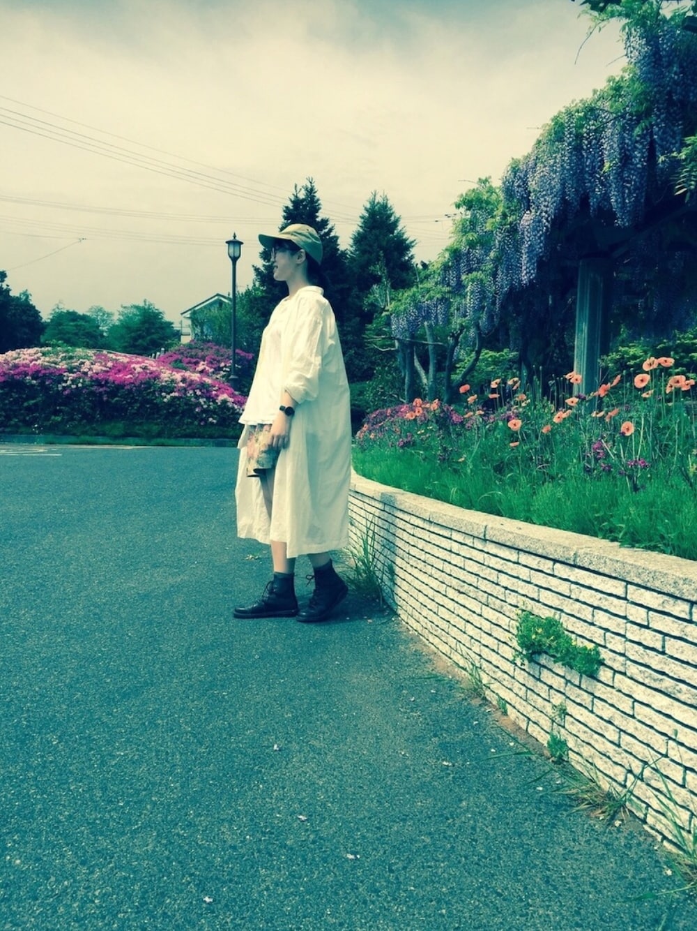 地元の中学校の近くの公園のつつじと藤が綺麗だったので、映えるコーデで撮ってみました。 アウターの中の服と帽子は古着です😌