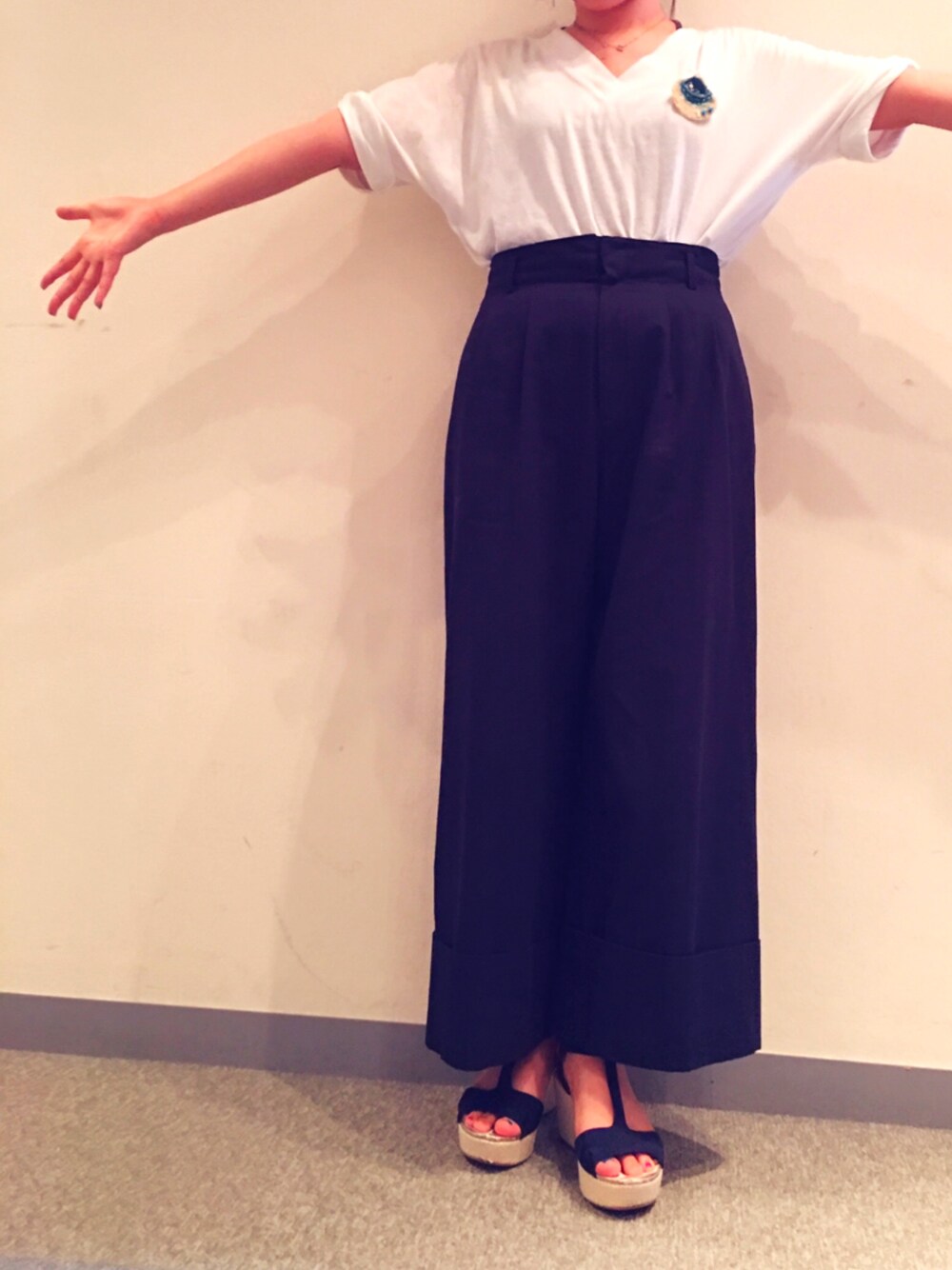 同じく授業で制作したパンツの発表会の時の写真です!このシャツお気に入りで色違いの黒も持っています😊パンツは、市場調査した時に感じた流行のポイントなども入れつつ、ワイドパンツで裾の折り返しを太めにとり、後ろにパッチポケットも付けました。