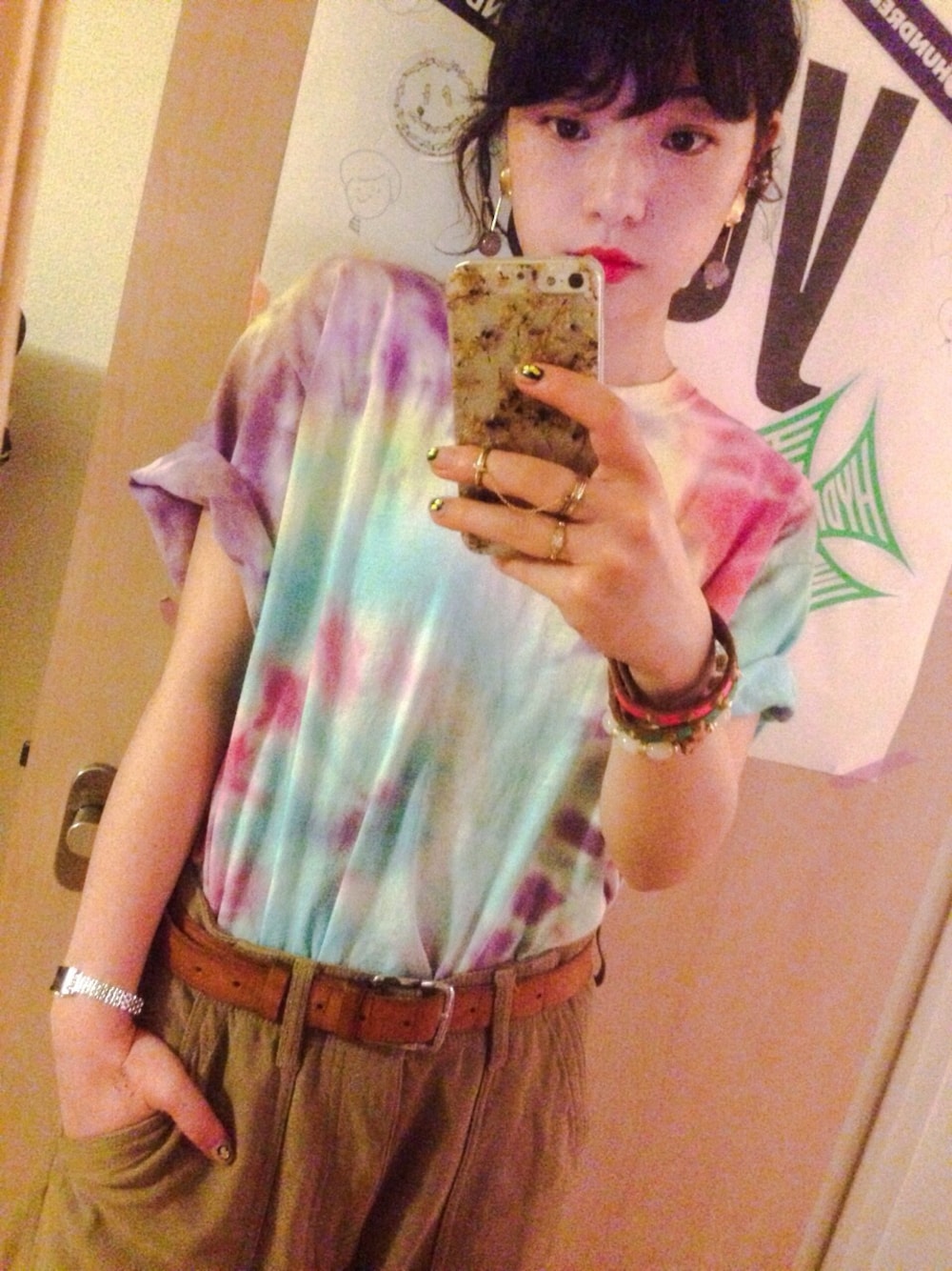 千葉の古着屋さんで買ったタイダイ柄Tシャツに spellで買ったイヤリングを合わせて…💜💙💛 ANREALAGEのiPhoneケースもお気に入りです🙈💓
