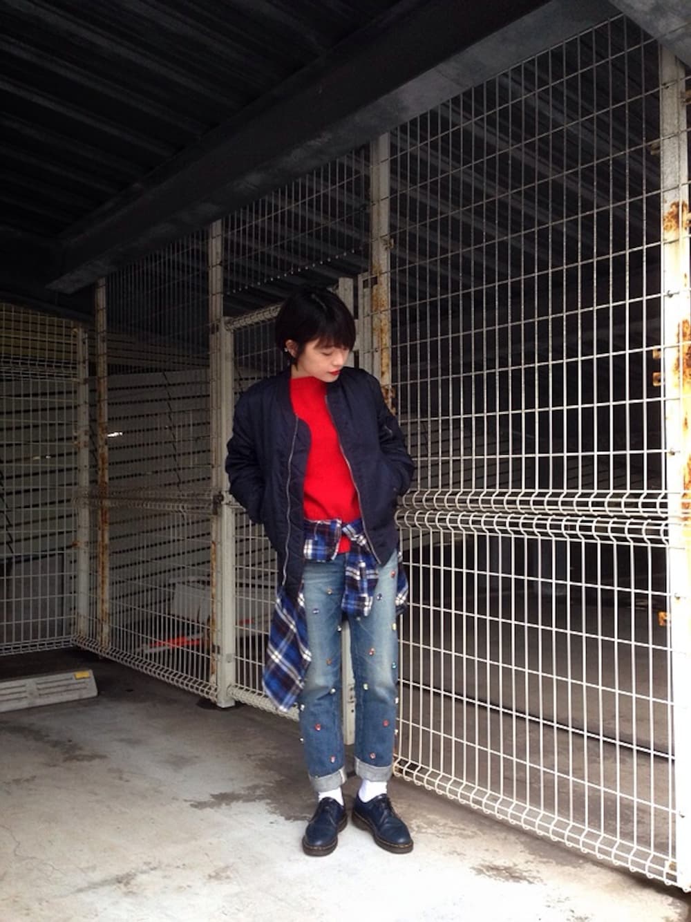 鮮やかな赤ニットがさし色 💃💃💃 ネルシャツを腰に巻いてキムタクスタイル🙋👏 jacket : USED knit : Demi-Luxe BEAMS pants : TRESOR shirt : UNIQLO shoes : Dr.Martens