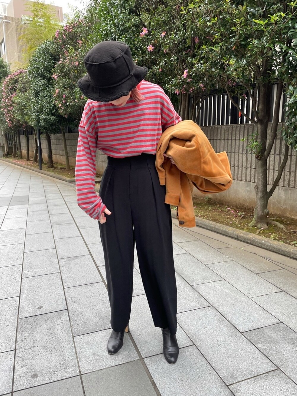 えんじ×グレーボーダーは、思った通りブラックアイテムとよく合いました🍷🖤 Instagram:mami_0421