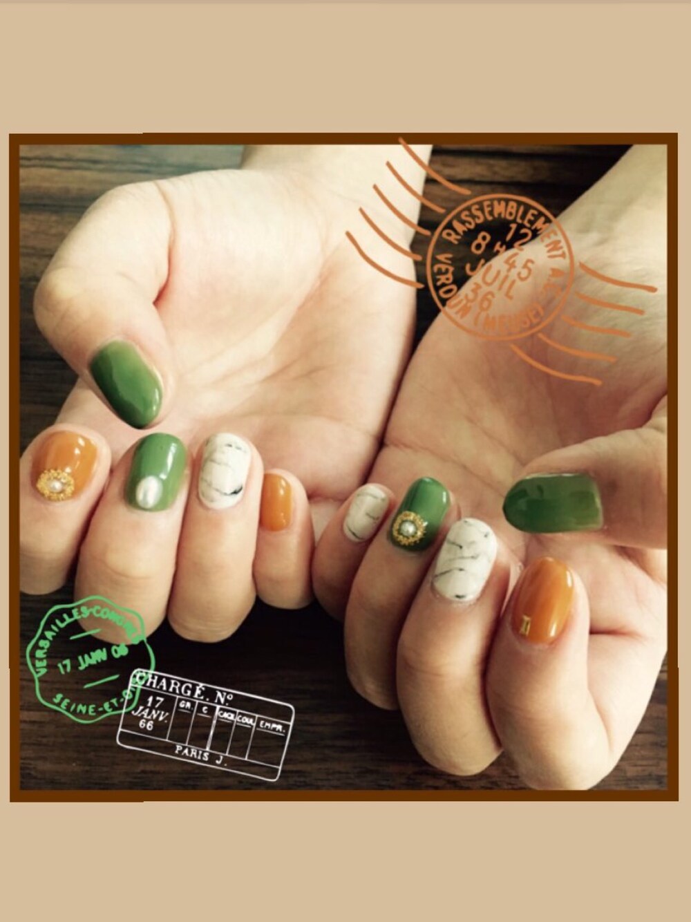 つめもおしゃれしなきゃー♪ 今回は、秋色に❤︎ カーキ×キャメル×大理石風 かわいーい❤︎