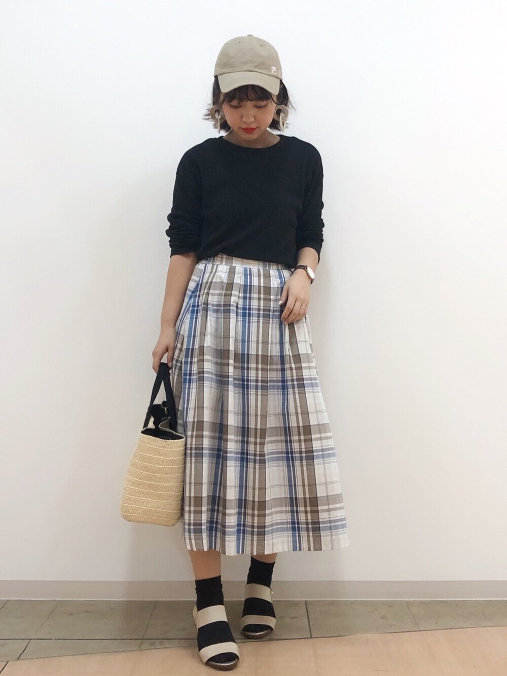 チェックスカートは黒のトップスで 大人めに着るのが好きです🙆♀️💕 靴下にサンダル👡もスカート合わせに おすすめです✨✨