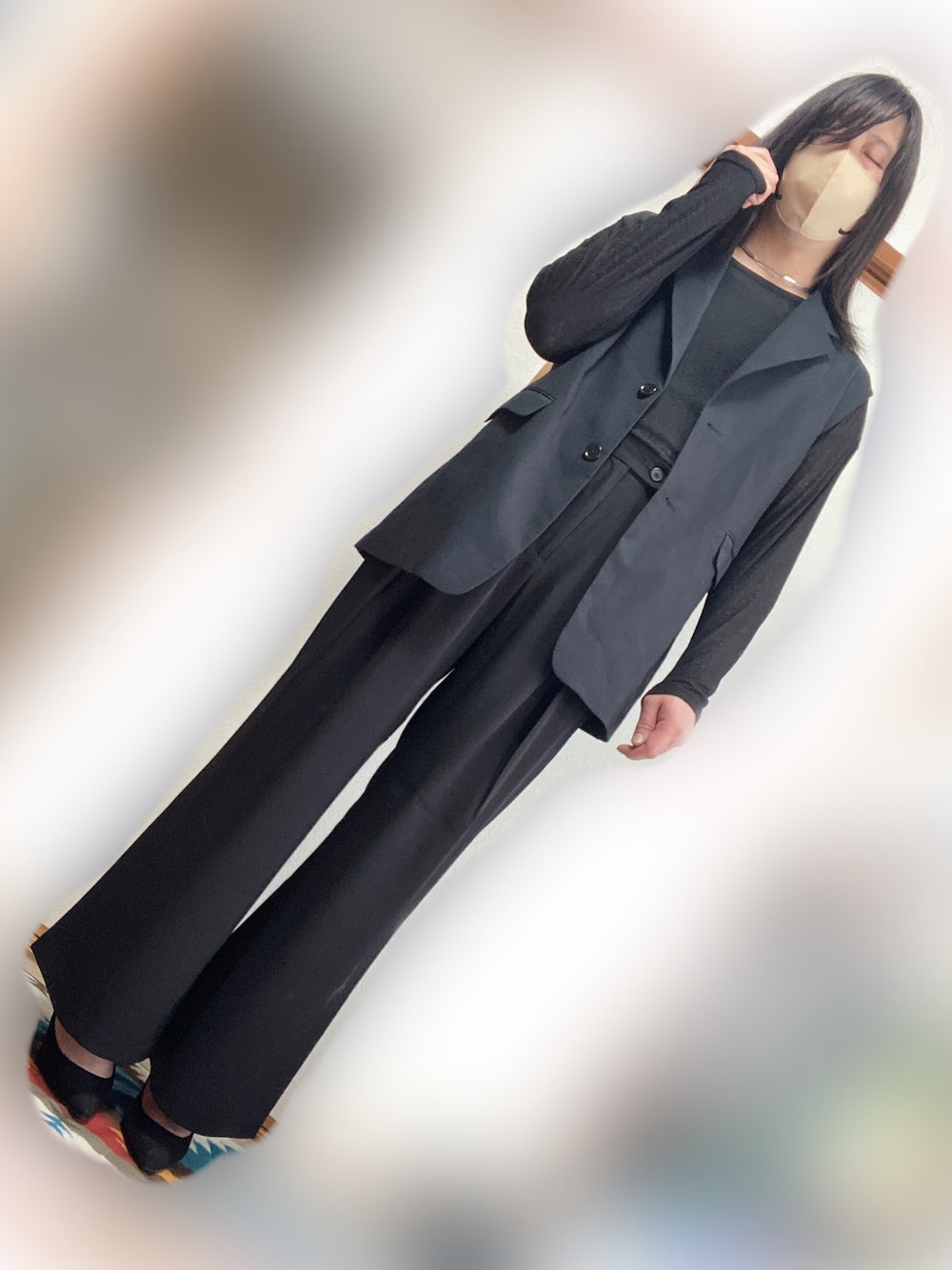 ブラックコーデ🎶 シアーTシャツにベスト🥰 幅の広いフレアパンツにパンプス合わせました😁