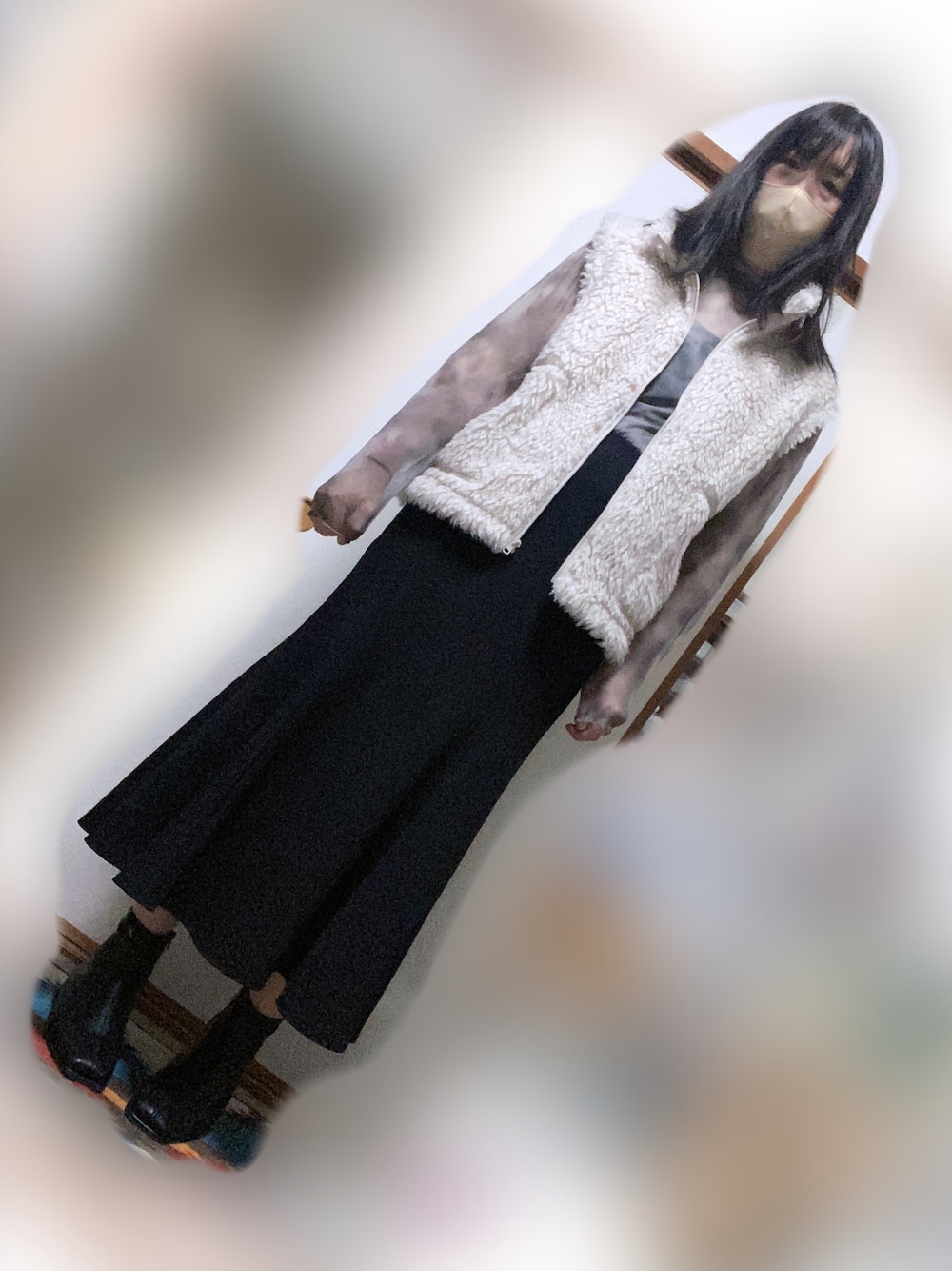 今日のお出掛けコーデ♫ まだ暖かいのでシアートップスにフリースベスト☺️ マーメイドスカートとショートブーツ🥰