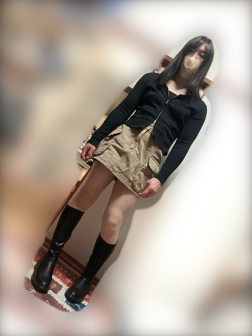前回のカーディガンの黒 カーゴミニスカートにロングブーツ合わせました😄