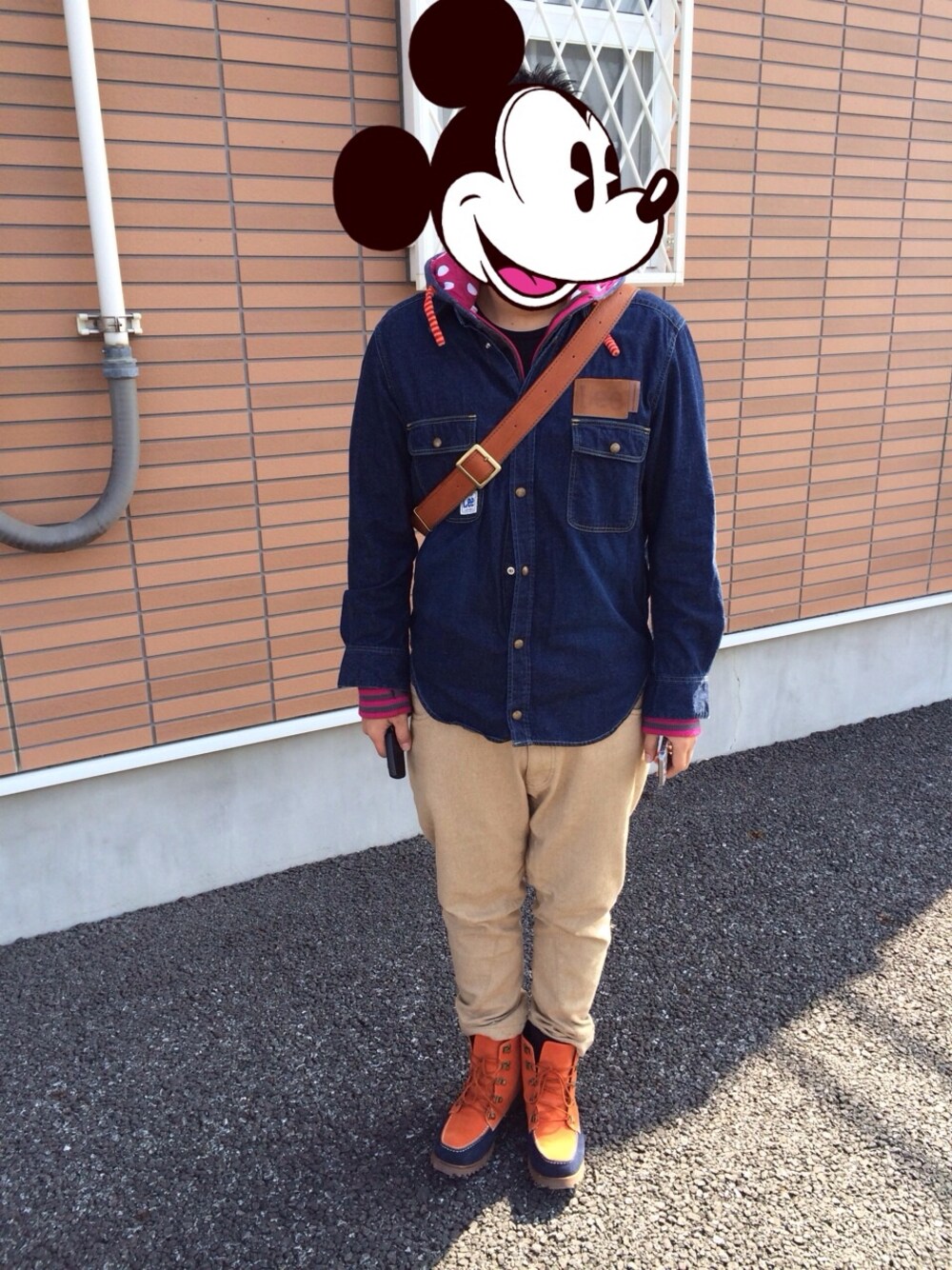 旦那コーデ∩^ω^∩ メルシーのデニム羽織が中々使えるみたいでよく着てる✴︎ オレンジのブーツは個人的にお気に入りです笑