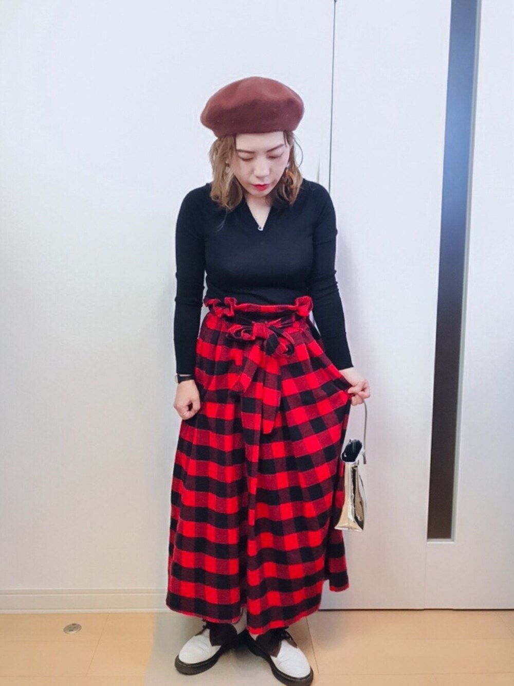 まみのスカート「-ネルバッファローCHウエストリボンタックスカート」を使ったコーディネート