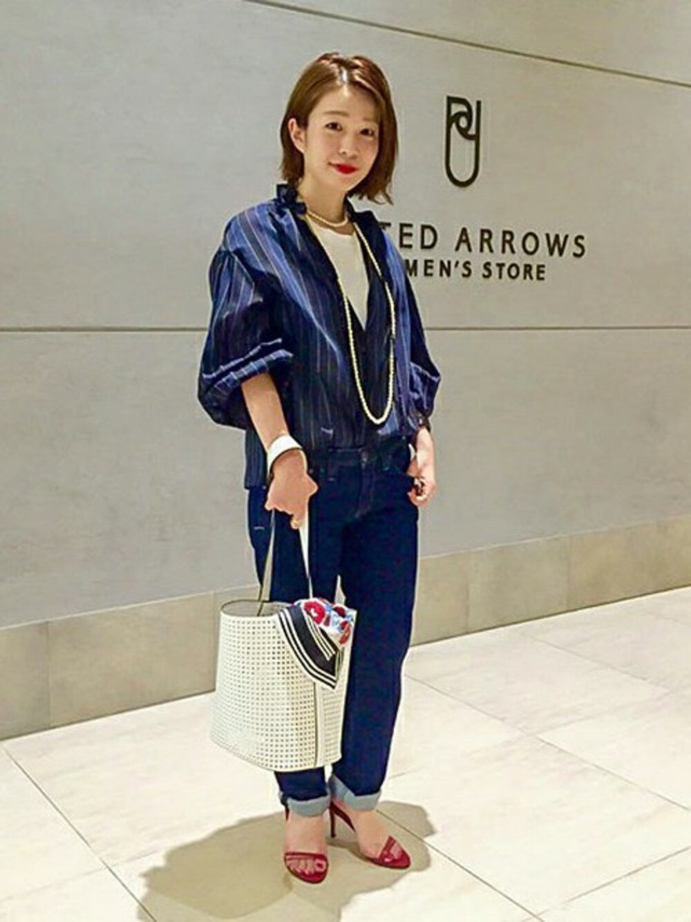 定番アイテムをおしゃれに変化させる、フレンチな着こなしが気になる今日このごろ。 デニムに少し透け感のあるボリュームブラウスを合わせてトレンド要素をプラス。 またフレンチっぽい味付けとして、赤の小物とリップをチョイス。 大人の上質感をパールとスカーフで表現しました。