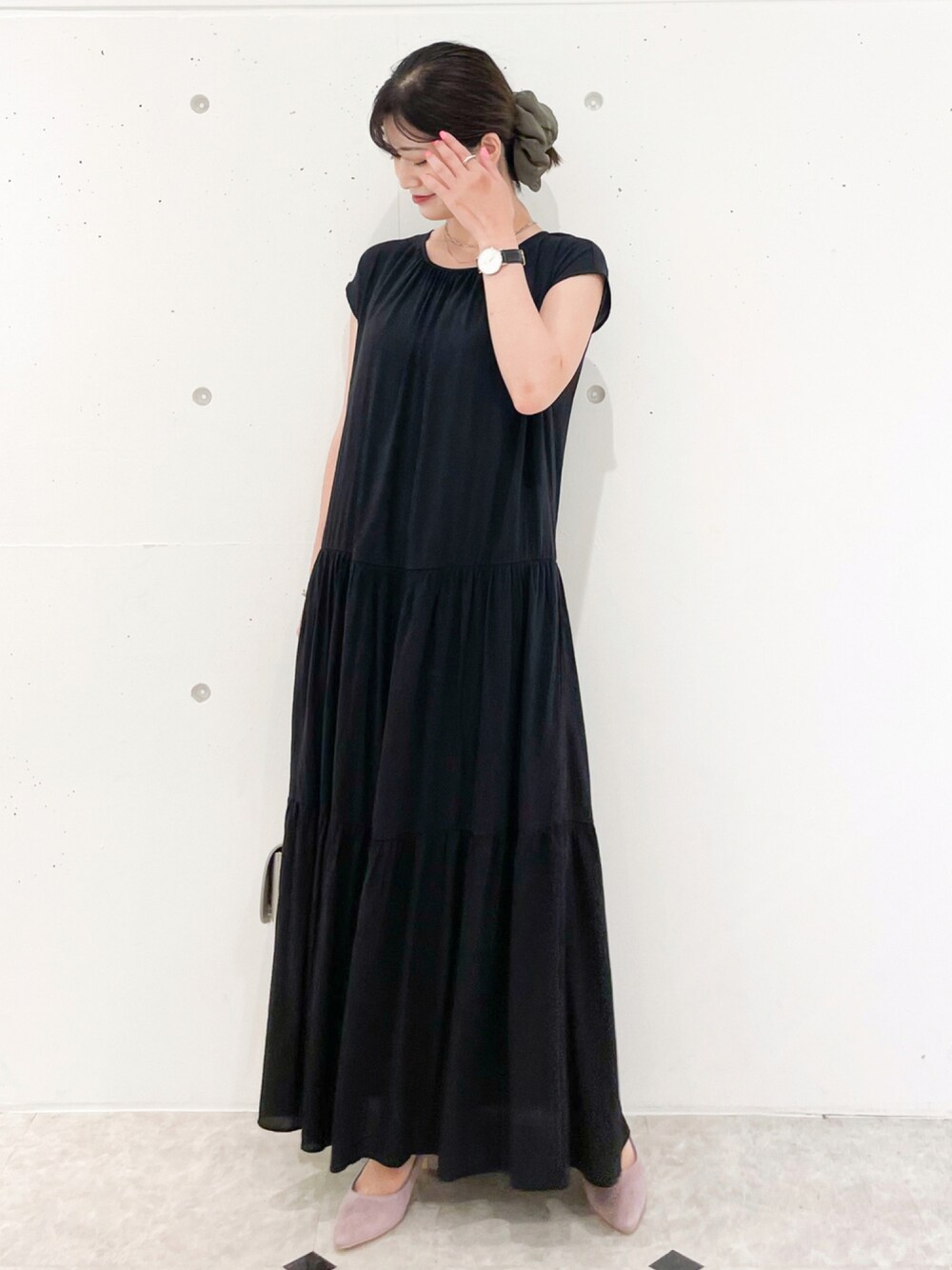 ブラックのワンピースにキレイ目な小物を合わせてお出かけコーデに。 足元はくすみピンクで華やかさをプラス。