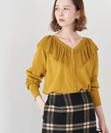 マスタードカラーは秋に絶対着たくなる色。 チェック柄のスカートと合わせて華やかに。
