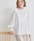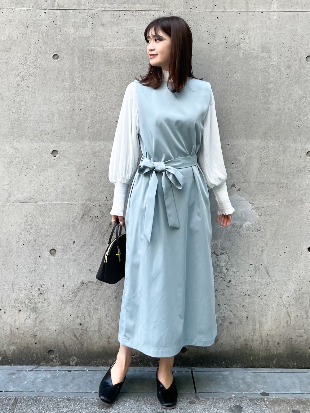 ジャンパースカートを使ったお出かけスタイル。 インナーには白のブラウスを合わせて上品な印象に。