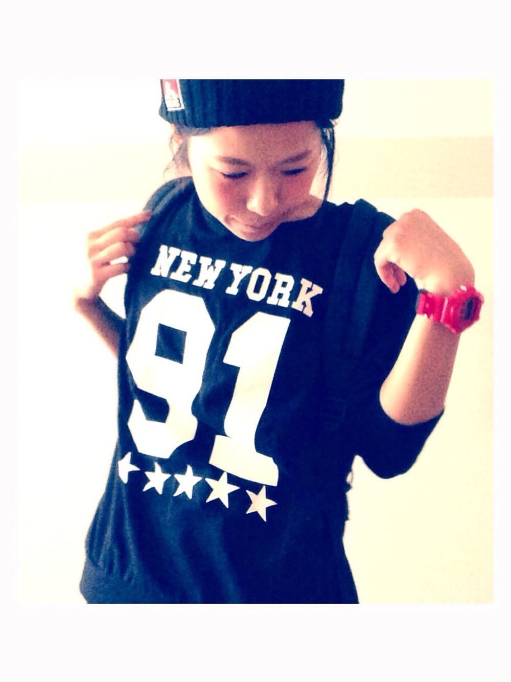 友達からプレゼントしてもらったカットソーはH&Mのやつ。 めちゃくちゃかわいくて大好き♡ 今回はブラックで統一して、時計とスニーカーで赤を足してみたり。