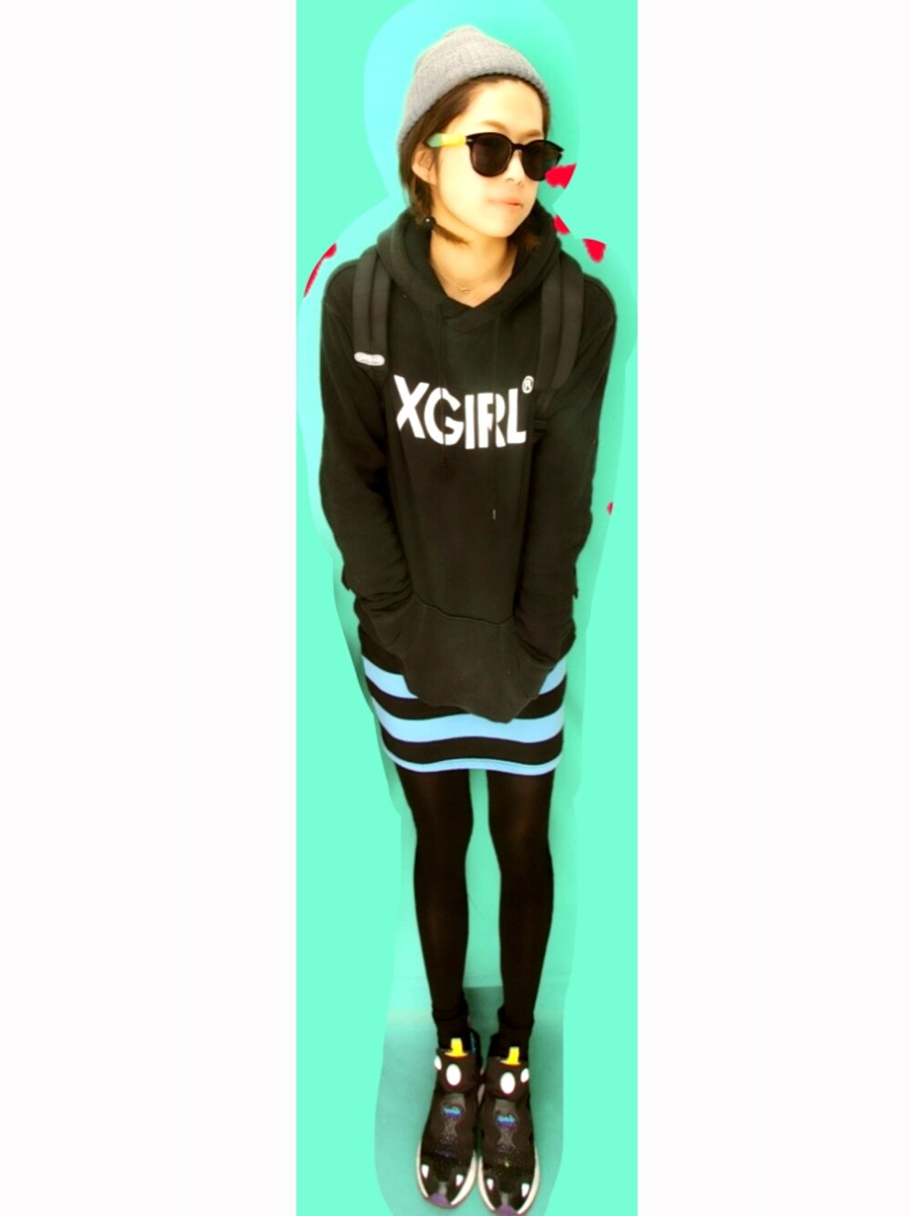 着丈長めのビッグパーカーは、 スカート丈短めでバランス〜!