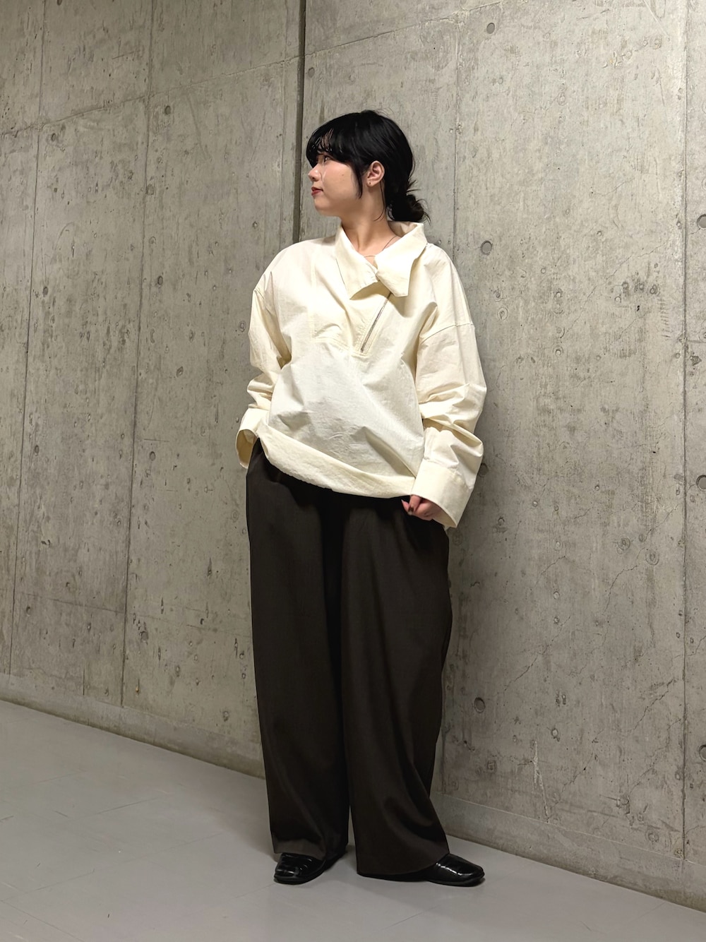 ご覧いただきありがとうございます♪ トップスはハリのある質感でシンプルなデザインなのでパンツでもスカートでもどちらでも合わせやすいアイテムです! ぜひ店頭でお試しください♪