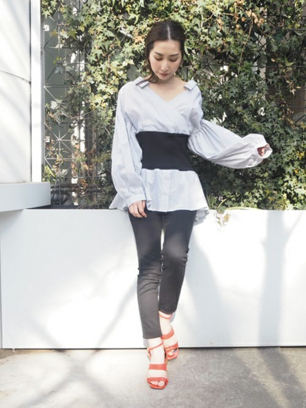 春のモードスタイルのご紹介です! ウエストにコルセット風のデザインがあるドッキングシャツと スキニーパンツのシンプルスタイル。 モノトーンで締めて、 足元だけレッドで色を入れるのがポイントです!